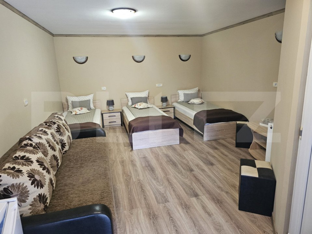 BLITZ vă propune o oportunitate unică de investiție – Pensiune de excepție în proximitatea Cetății Devei și a Aqua Land-ului! Descoperiți o proprietate impresionantă, perfectă pentru a dezvolta o afacere de succes în domeniul turismului! Situată într-o zonă de top, aproape de Cetatea Devei și de renumitul Aqua Land, această pensiune oferă un cadru ideal pentru relaxare și confort. Caracteristici deosebite și spațiu generos: ???? Corpul principal C2 – Eleganță și spațiu pe Demisol + Parter + 2 Etaje + Mansardă: Demisol: 3 camere, hol, 2 băi, bucătărie – ideal pentru personal sau spațiu tehnic. Parter: 2 camere, bucătărie, 2 băi – perfect pentru recepție sau locuință administrativă. Etaj 1: 3 camere, fiecare cu baie proprie și balcon – confort maxim pentru oaspeți. Etaj 2: 3 camere cu băi proprii și balcoane – vedere spectaculoasă și intimitate. Mansardă: 3 camere cu băi și balcoane – un spațiu romantic cu o atmosferă de poveste. ???? Corpul C3 – 7 camere complet utilate, cu grup sanitar propriu, încălzire centrală și boiler de 500 l pentru apă caldă. ???? Corpul C4 – 4 apartamente moderne, cu încălzire cu infraroșu, TV cablu și internet, pe 2 niveluri (P+M). ???? Corpul C1 – 2 camere intime, cu grup sanitar propriu, încălzire, TV și internet. Beci la subsol, ideal pentru depozitare. Facilități premium pentru confortul oaspeților: ✨ Aer condiționat în toate camerele, pentru confort pe tot parcursul anului. ✨ Internet de mare viteză și TV cablu în toate unitățile de cazare. ✨ 2 terase generoase de 100 mp, mobilate modern cu mese, scaune, bar și barbeque, perfecte pentru evenimente și relaxare. ✨ Curte spațioasă, ideală pentru activități în aer liber. Avantaje și potențial investițional: ✅ Localizare excelentă, aproape de Cetatea Devei și Aqua Land, atracții turistice majore. ✅ Posibilitatea extinderii sistemului de încălzire centrală de la corpul C3 – flexibilitate în administrare. ✅ Compartimentare inteligentă și multifuncțională, ideală pentru o pensiune de succes sau un complex hotelier de tip boutique. ✅ Front stradal de 20.5 m, vizibilitate excelentă și acces ușor. Oportunitate rară la un preț competitiv! Această pensiune este perfectă pentru investitori sau pentru cei care își doresc să administreze o afacere de familie în turism. Designul elegant și poziționarea strategică o transformă într-o alegere de top pentru turiștii care caută confort și acces rapid la atracțiile orașului Deva. ???? Contactați acum echipa BLITZ pentru mai multe detalii și programați o vizionare! Nu ratați această oportunitate de succes în domeniul turismului! ????✨ Cod ofertă / ID BLITZ: P140365 Id intern: P140365