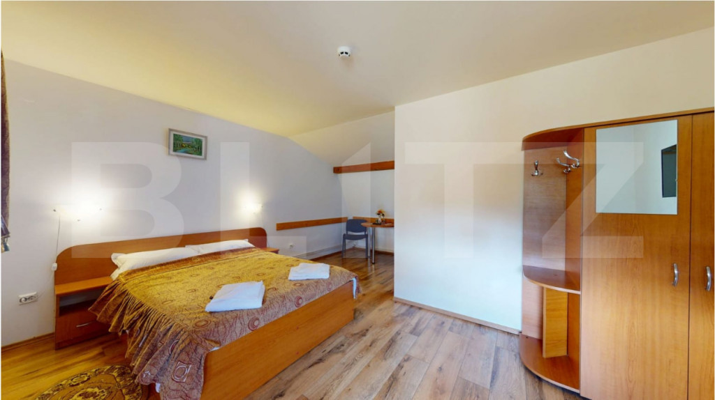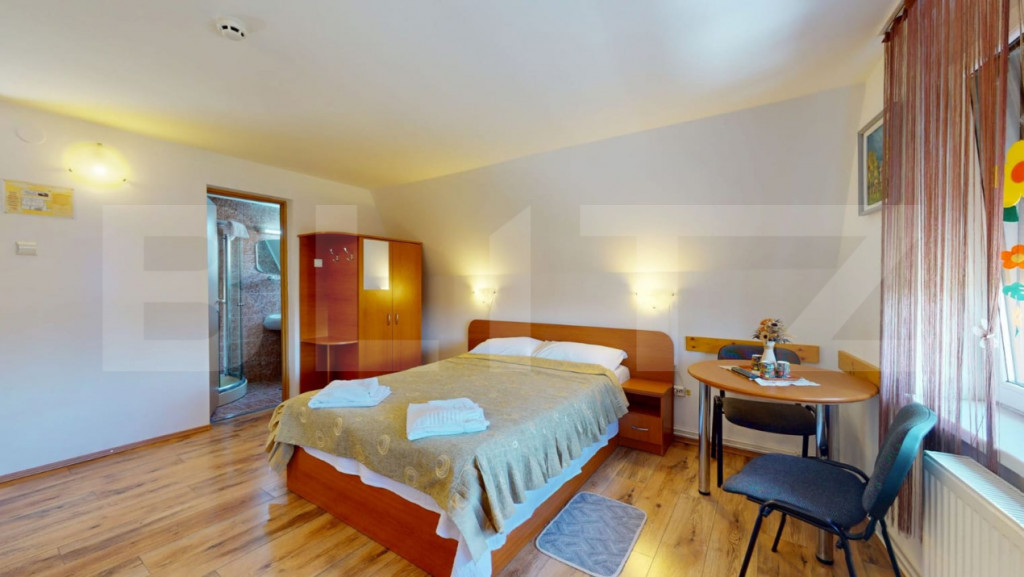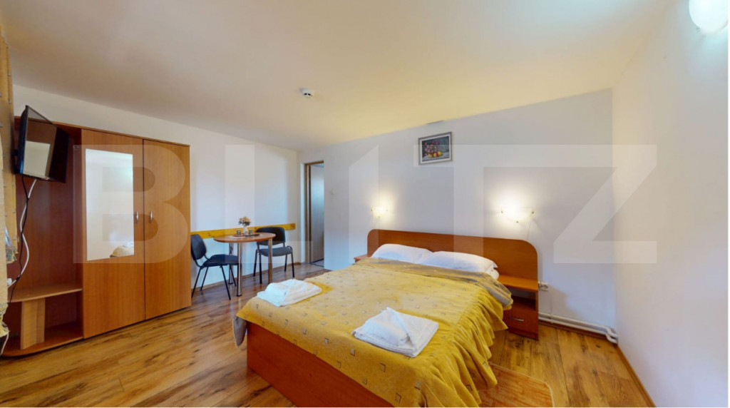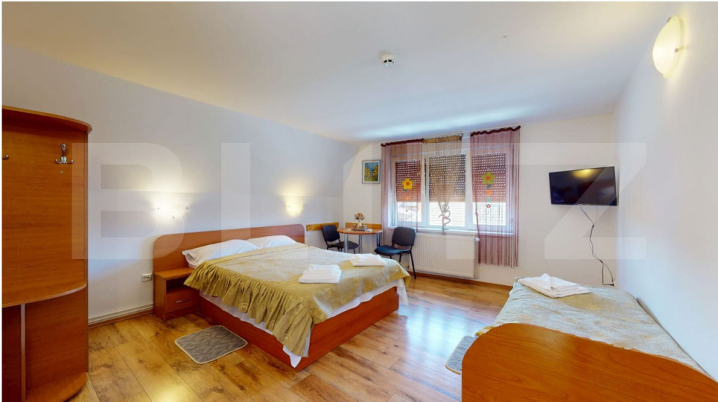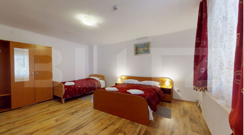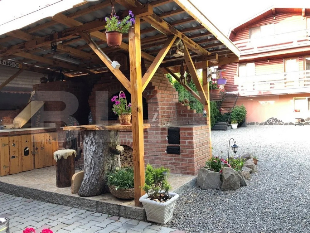 Blitz vă prezintă o proprietate turistică de excepție, situată în Săcele, județul Brașov, o pensiune complet echipată și operațională, concepută pentru randament imediat și dezvoltare sustenabilă în domeniul ospitalității. Date cheie ale investiției: Suprafață teren: 765 mp Suprafață construită: 655 mp Suprafață utilă: 433 mp 15 camere elegante, fiecare cu baie proprie 6 locuri de parcare Structură solidă din cărămidă Încălzire pe gaz Proprietate disponibilă imediat Concept & compartimentare: Proprietatea este organizată în 3 clădiri distincte, optim gândite pentru funcționare eficientă: Clădire frontală – zonă administrativă & logistică Construcție din cărămidă, ce integrează: Recepția pensiunii Cameră personal cu baie Spălătorie, cămară, bucătărie Pivniță tehnică cu sistem de pompare și rezervor de apă de 500 l Spațiu rezidențial: 3 camere, dressing și baie Clădirea principală – zona de cazare: 13 camere cu băi proprii, finisate funcțional Parter: 4 camere + bucătărie complet utilată 2 centrale IMERGAZ ZEUS – 35 kW (2024) pentru eficiență energetică Tâmplărie premium Rehau, ferestre Velux Scară interioară din lemn, cu posibilitate de montare lift Clădire secundară – restaurant & apartament privat Sală de mese elegantă Bucătărie profesională din inox Terasă acoperită Etaj (2018): apartament privat cu living open-space, 2 dormitoare, baie și vedere panoramică spre munți Experiență & facilități exterioare: Curte amenajată peisagistic Iaz decorativ Ciubăr pentru relaxare Zonă gourmet: grătar zidit, rotisor, afumătoare Mobilier rustic din lemn masiv – atmosferă autentică și primitoare Argumente investiționale: ✔ Proprietate „la cheie”, gata de operare ✔ Infrastructură completă, fără investiții suplimentare majore ✔ Potențial ridicat de ocupare și extindere servicii ✔ Poziționare avantajoasă, aproape de Brașov și zone turistice O oportunitate rară pentru investitori care caută stabilitate, imagine și profit. Pentru detalii suplimentare și programarea unei vizionări, vă rugăm să ne contactați. Cod ofertă / ID BLITZ: P163737 Id intern: P163737