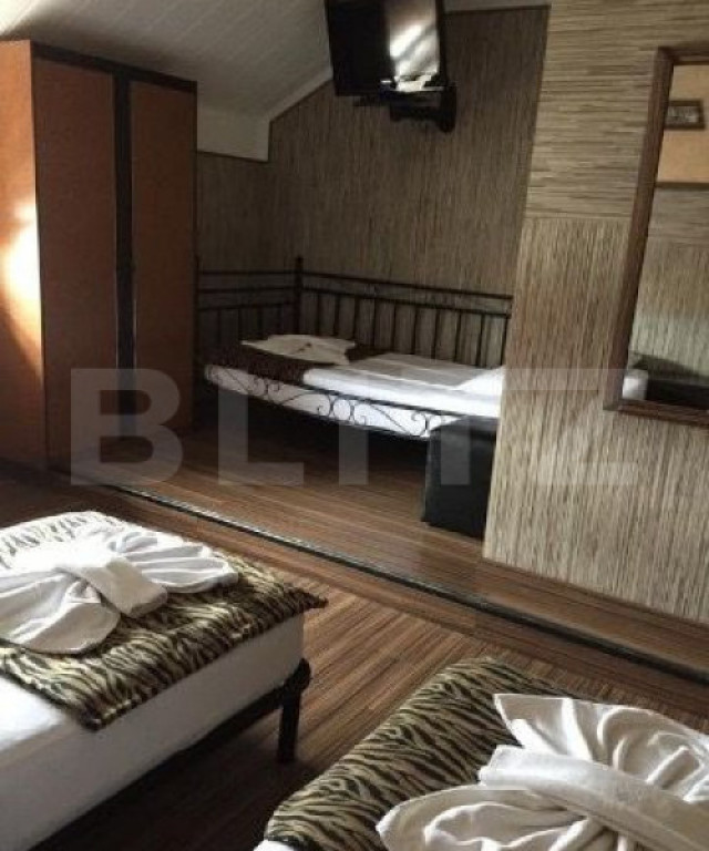 Pensiune de vânzare, ideală pentru investiție în turism, cu o suprafață utilă de 450 mp și amplasată pe un teren de 400 mp. Proprietatea este compartimentată eficient și dispune de 12 camere spațioase, fiecare cu baie proprie, însumând un total de 14 băi. Pensiunea beneficiază de un birou pentru manager și o zonă de recepție primitoare, perfectă pentru întâmpinarea oaspeților. Spațiile comune includ o sală de mese interioară și una exterioară, oferind flexibilitate pentru servirea mesei în orice sezon. Bucătăria este complet amenajată și adaptată pentru activități de tip horeca. La subsol se află zona tehnică a pensiunii, precum și o cameră de depozitare destinată lenjeriei (cearșafuri și prosoape), asigurând o organizare eficientă a activității. În fața proprietății sunt disponibile 5 locuri de parcare, un avantaj important pentru confortul turiștilor. Pensiunea reprezintă o oportunitate excelentă pentru dezvoltarea unei afaceri în domeniul ospitalității, fiind pregătită pentru funcționare imediată. Cod ofertă / ID BLITZ: P167425 Id intern: P167425