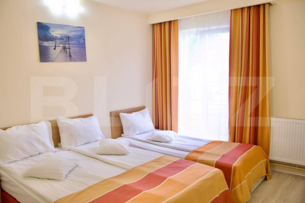 BLITZ vă propune spre vânzare o pensiune turistică clasificată la 3 margarete, afacere funcțională și profitabilă, cu clientelă deja formată și activitate în desfășurare, situată în Tășnad, într-o zonă turistică apreciată, renumită pentru apele termale cu efecte benefice. Proprietatea reprezintă o investiție sigură în domeniul turismului balnear, beneficiind de o amplasare excelentă, la câțiva pași de principalele puncte de interes din stațiune, ceea ce asigură un flux constant de turiști pe tot parcursul anului. Date generale: ???? Suprafață teren: 1.600 mp (16 ari) ???? Capacitate: 18 camere + 1 apartament ???? Dotări camere: baie proprie, TV, mini-frigider ???? Clasificare: 3 margarete ???? Parcare: 15 locuri dedicate clienților Facilități și dotări: ????Piscină interioară cu apă termală – ideală pentru orice anotimp ????Sală de mese dotată și utilată cu frigidere , mini-plite (pentru servirea micului dejun), cafetiere, mașina de spălat vase ????Terasă acoperită pentru relaxare și socializare iar la etaj o terasă în aer liber care înconjoară clădirea, unde ne putem bucura de frrumusetea orașului sau a curtii. ????Foișor cu cuptor din cărămidă pentru barbeque, și grătar , cu mese și scaune ????Grădină spațioasă, amenajată cu șezlonguri și spațiu verde ????Imobilul dispune de geamuri termopan, asigurând izolație termică și fonică optimă. Fiecare cameră este dotată cu calorifere proprii prevăzute cu termostat, oferind confort individual și eficiență energetică. ????Clădirea este echipată cu centrale termice pe gaz, marca Buderus și boilere pentru apa calda menajera , Romstal, garantând un sistem de încălzire modern, fiabil și economic. ????Un avantaj major al proprietății îl constituie existența unei încăperi dedicate, ce poate fi amenajată rapid ca bucătărie complet funcțională, oferind posibilitatea schimbării destinației imobilului – azil de bătrâni, centru rezidențial, centru de recuperare, clinică privată sau alte activități cu servicii integrate. Construcția este solidă, bine întreținută și pregătită pentru exploatare imediată, fiind ideală atât pentru continuarea activității turistice, cât și pentru reconversie într-un alt tip de business. ????Se predă la cheie, cu posibilitatea continuării imediate a activității. Pentru mai multe detalii privind prețul și condițiile de vânzare, vă stăm la dispoziție. Cod ofertă / ID BLITZ: P164373 Id intern: P164373