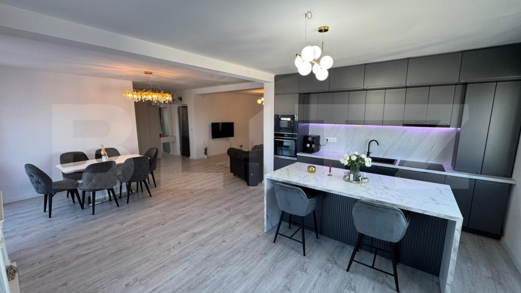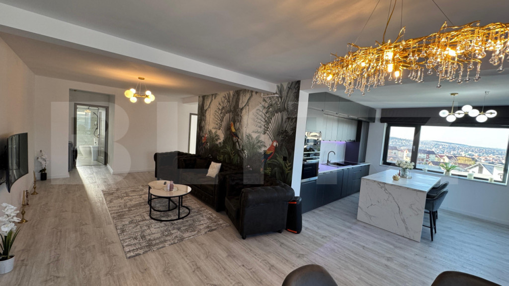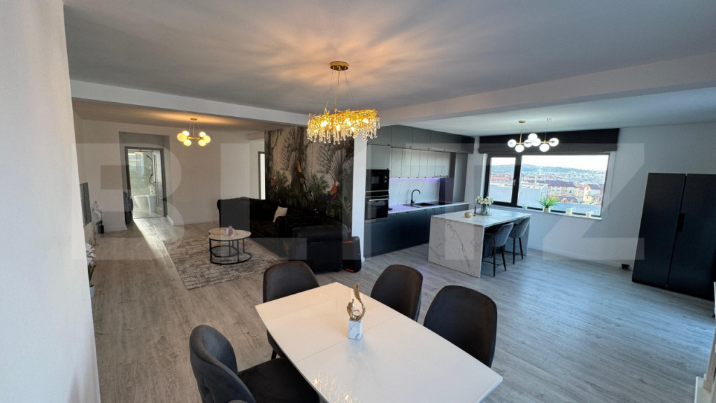 Blitz va prezinta un penthouse spectaculos, situat într-una dintre cele mai apreciate zone ale orașului, unde confortul și eleganța se îmbină perfect. Proprietatea impresionează prin finisaje premium, alese cu grijă pentru a crea un ambient modern și rafinat, precum și prin mobilierul de calitate, care completează armonios fiecare încăpere. Spațiul generos este luminat natural pe tot parcursul zilei, oferind o atmosferă caldă și primitoare. Livingul deschis se îmbină perfect cu zona de dining și bucătăria complet utilată, creând locul ideal pentru relaxare sau socializare. Punctul forte al acestui penthouse este terasa de 28 mp, un spațiu perfect pentru momente de liniște, cafeaua de dimineață sau seri petrecute alături de cei dragi, cu o priveliște deosebită asupra orașului. Ideal pentru cei care își doresc un stil de viață exclusivist, într-o locație excelentă, această proprietate oferă echilibrul perfect între intimitate, confort și acces rapid către toate punctele de interes. Cod ofertă / ID BLITZ: P168925 Id intern: P168925