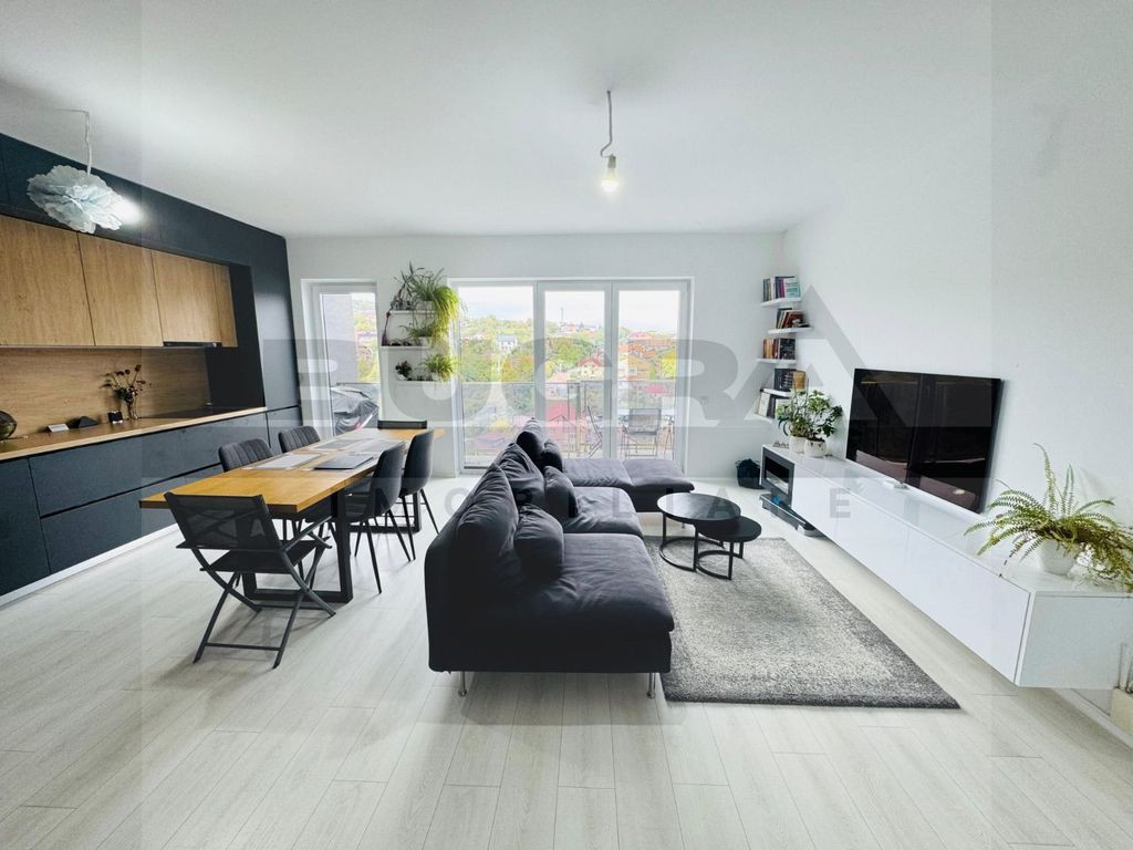 Bugra Imobiliare vă propune spre vânzare un apartament cu adevărat special, o locuință care îmbină spațiul generos, confortul modern și o terasă spectaculoasă cu panoramă asupra orașului. Este genul de proprietate în care fiecare zi începe cu lumină naturală și se termină cu momente de relaxare în aer liber. Cu o suprafață utilă de 94,11 mp și o terasă impresionantă de 38 mp, accesibilă din fiecare cameră, acest apartament oferă o experiență de locuire rar întâlnită. Terasa devine o extensie naturală a locuinței – locul perfect pentru dimineți liniștite cu cafeaua în mână, seri petrecute cu prietenii sau pur și simplu pentru a te bucura de priveliștea panoramică asupra orașului. Interiorul este gândit inteligent și armonios. Livingul open-space cu bucătăria creează un spațiu aerisit și primitor, ideal pentru viața de zi cu zi sau pentru momentele petrecute cu familia. Bucătăria este complet mobilată și utilată cu mobilier realizat la comandă, iar pentru cei care preferă o compartimentare clasică, aceasta poate fi separată cu ușurință. Apartamentul dispune de 3 dormitoare confortabile, perfecte pentru o familie sau pentru amenajarea unui birou de lucru acasă, 2 băi elegante – una cu cadă pentru momentele de relaxare și una cu duș pentru ritmul alert al zilei – precum și un dressing dedicat și un hol spațios care oferă o organizare eficientă a locuinței. Confortul este completat de încălzirea în pardoseală, centrala termică proprie, geamuri mari care aduc multă lumină naturală și rulouri la toate ferestrele, cele din dormitoare fiind electrice pentru un plus de comoditate. Apartamentul se vinde complet mobilat și utilat, cu mobilier de calitate și electrocasnice moderne, astfel încât vă puteți muta imediat, fără alte investiții. Pe terasa generoasă veți găsi deja mobilier de exterior și grătar, incluse în preț – pregătite pentru seri relaxante sau mese în aer liber. Proprietatea se află într-un imobil modern construit în 2018, dotat cu două lifturi rapide, iar zona oferă acces facil către transport public, magazine, sală de sport și alte puncte de interes, pentru un stil de viață confortabil și bine conectat. Pentru un plus de confort, există posibilitatea achiziționării a două locuri de parcare subterane, disponibile contracost. Dacă vă doriți o locuință spațioasă, luminoasă și cu o terasă care transformă fiecare zi într-o experiență, acest apartament merită cu siguranță descoperit. Bugra Imobiliare vă invită cu drag la vizionare.