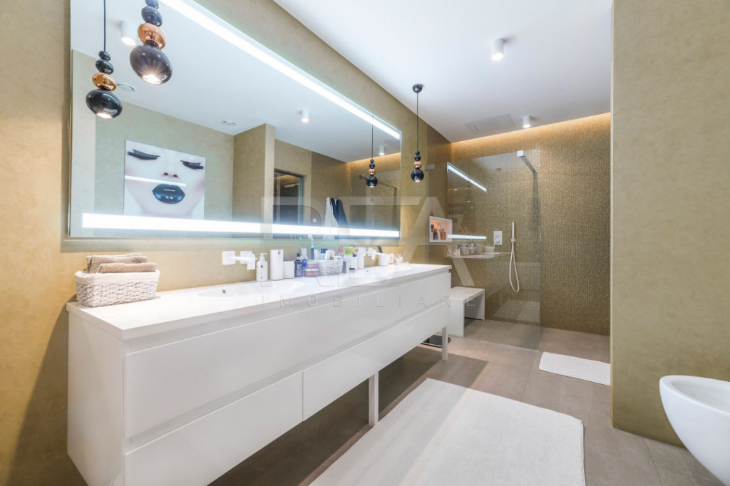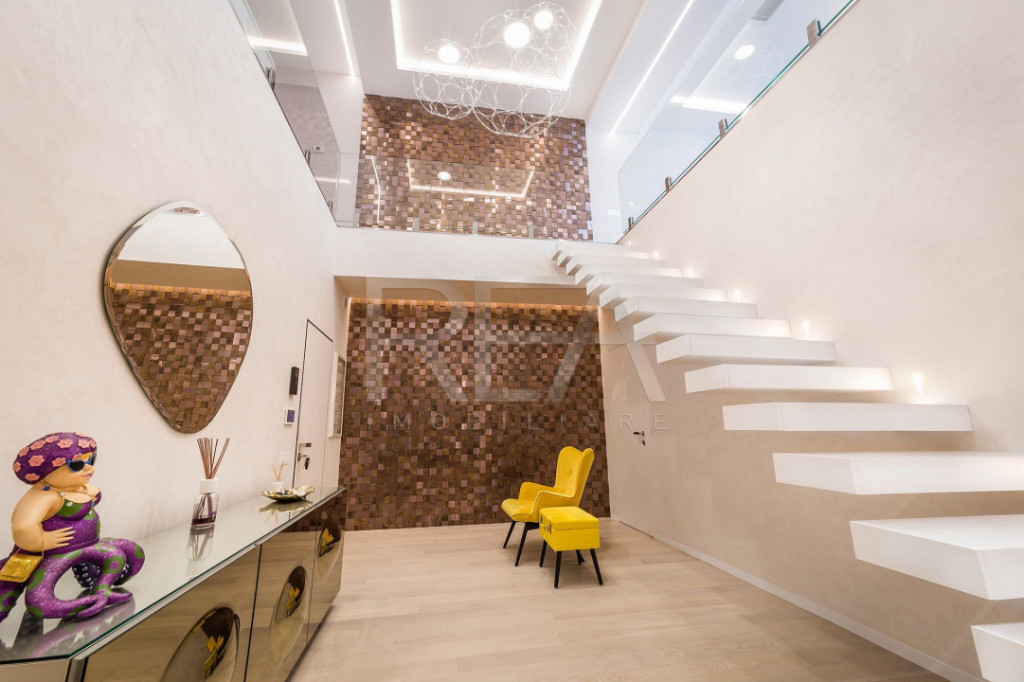 R.E.A. Imobiliare va prezinta spre vanzare acest penthouse din complexul Persepolis, amplasat în Cartierul Francez – Herăstrău, conceput ca un exercițiu de arhitectură pură, în care spațiul, lumina și materialele sunt lăsate să vorbească fără artificii inutile. Nu este un apartament decorat, ci un volum locuit, gândit cu rigoare, claritate și o atenție obsesivă pentru detaliu. Încă de la intrare, relația dintre niveluri este definită de golul generos pe dublă înălțime și de scara cu desen minimalist, tratată aproape sculptural. Absența balustradelor clasice și folosirea exclusivă a unei mâini curente discrete elimină orice barieră vizuală, accentuând fluiditatea spațială și permițând luminii să circule liber în întregul penthouse. Zona de zi – etajul superior Etajul superior este gândit ca un spațiu deschis, continuu, în care livingul, diningul și bucătăria coexistă într-un echilibru natural. Suprafețele vitrate ample dizolvă granița dintre interior și exterior, conducând privirea către terasa panoramică de peste 90 mp, desfășurată pe două laturi. Aceasta devine o extensie firească a zonei de zi, un spațiu de locuire în aer liber, cu deschideri largi și perspective curate. Propunerea de mobilare evidențiază perfect caracterul arhitectural al spațiului: forme moi, piese cu muchii rotunjite, finisaje lucioase și accente metalice calde. Insula de bucătărie, desenată cu linii fluide și colțuri curbate, funcționează ca ax social al etajului, un obiect central care organizează circulațiile și relațiile dintre funcțiuni. Zona de living este tratată ca un spațiu de reprezentare, dar și de confort autentic. Mobilierul ales păstrează proporțiile ample ale camerei, fără a încărca vizual volumul. Texturile, paleta cromatică calmă și iluminatul atent calibrat creează o ambianță sofisticată, dar relaxată, adaptabilă atât momentelor sociale, cât și celor intime. Iluminatul arhitectural este integrat subtil: benzi luminoase perimetrale, corpuri suspendate cu rol sculptural și surse punctuale care modelează spațiul fără a-l fragmenta. Zona de noapte – nivelul inferior Nivelul inferior este dedicat intimității și retragerii, adăpostind patru dormitoare, dintre care două cu băi matrimoniale, precum și zone de depozitare amplu dimensionate. Dormitorul principal este tratat ca o suită privată, unde materialele textile, tapetul decorativ și mobilierul cu linii curate construiesc o atmosferă calmă, echilibrată, lipsită de ostentație. Propunerea de mobilare pune accent pe confort, proporție și textură: patul devine elementul central, flancat de volume joase, iar lumina este utilizată pentru a crea profunzime și o senzație de refugiu urban. Băile matrimoniale sunt amenajate într-o cheie contemporană, cu obiecte sanitare suspendate, oglinzi iluminate perimetral și finisaje premium. Sunt spații gândite nu doar funcțional, ci ca zone de wellness domestic, în care detaliul și materialitatea sunt esențiale. Dressingurile walk-in completează experiența locuirii, fiind organizate logic, aerisit și perfect iluminate, transformând depozitarea într-un gest firesc și elegant. Concept și identitate Acest penthouse se remarcă prin coerența conceptului, prin claritatea volumelor și prin modul în care arhitectura și designul interior se susțin reciproc. Nu există elemente gratuite, nimic demonstrativ. Totul este redus la esență: spațiu, lumină, material. Este o proprietate pentru cei care înțeleg luxul ca spațiu bine gândit, ca liniște vizuală, ca fluiditate și proporție. Un penthouse care nu caută să impresioneze prin decor, ci prin inteligența arhitecturală și calitatea experienței de locuire. Varianta de mobilare prezentata se poate realiza dupa incheierea unui antecontract notarial si achitarea unui avans. Pentru mai multe detalii si vizionari, ne puteti contacta telefonic, specificand codul de identificare P9981. Id intern: P9981