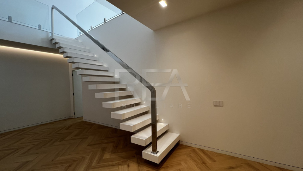 R.E.A. Imobiliare va prezinta spre vanzare acest penthouse din complexul Persepolis, în zona Herastrău – Șoseaua Nordului Un exercițiu de claritate spațială in care nu se caută efecte, nu se mizează pe decor, ci pe volum, proporție și relația dintre lumină și materiale. Încă de la primul contact, se simte o intenție coerentă de design: spațiile sunt gândite să curgă, să respire, să funcționeze fără artificii. Structura generală Locuința este organizată pe două niveluri, cu o separare clară între: - zona de noapte (nivel inferior) - zona de zi și exterior (nivel superior) Această stratificare nu este doar funcțională, ci și senzorială: fiecare nivel are propria atmosferă, propriul ritm. Nivelul inferior – arhitectura liniștii Zona de noapte este caracterizată de ordine, calm și control vizual. Cele patru dormitoare sunt definite de geometrii simple, curate, fără fragmentări inutile. Dimensiunile sunt generoase, dar nu ostentative, iar poziționarea ferestrelor permite o lumină naturală echilibrată, care nu invadează, ci acompaniază si armonizează. Pardoseala din lemn masiv montat în pattern chevron joacă un rol important în percepția spațiului. Nu este un simplu finisaj, ci un element de direcționare vizuală, care conduce privirea și accentuează proporțiile încăperilor. Cele două băi matrimoniale sunt tratate ca volume autonome de relaxare. Microcimentul, suprafețele minerale continue, dușurile walk-in și obiectele sanitare suspendate construiesc un limbaj minimalist coerent. Nu există contrast dur, nu există decorativ gratuit. Totul este redus la esență: suprafață, textură, lumină. Scara – gestul arhitectural central Scara interioară este, fără îndoială, punctul de tensiune estetică al apartamentului. Treptele albe, late, suspendate vizual, creează o senzație de plutire. Lipsa unei balustrade clasice nu este o omisiune, ci o decizie de design. Prezența exclusivă a mâinii curente metalice, păstrează deschiderea verticală completă și elimină orice barieră vizuală. Rezultatul este un spațiu în care verticalitatea se simte amplu, continuu, neîntrerupt. Lumina coboară liber între niveluri, iar relația vizuală dintre etaje rămâne permanent activă. Iluminarea discretă a treptelor subliniază direcția și conferă scării o prezență aproape sculpturală, mai apropiată de o galerie de artă decât de un element funcțional. Nivelul superior – deschiderea Zona de zi este definită de transparență și expansiune. Livingul este amplu, dar extrem de bine controlat proporțional. Tavanele sunt curate, cu iluminat ambiental integrat, iar rigolele de climatizare sunt perfect ascunse, păstrând lizibilitatea volumului. Bucătăria este intenționat lăsată neutră din punct de vedere expresiv. Nu domină spațiul, ci se integrează în acesta, oferind libertatea unei personalizări adaptate stilului de viață al viitorului proprietar. Pardoseala continuă din lemn masiv leagă vizual întregul nivel, creând o curgere firească către exterior. Terasa – arhitectură extinsă Terasa panoramică, cu o suprafață de peste 90 mp, desfășurată pe două laturi, nu este un element adiacent, ci o extensie reală a interiorului. Tratată ca un spațiu arhitectural în sine, terasa permite multiple scenarii de utilizare: dining, lounge, zonă verde. Suprafețele vitrate ample estompează limita dintre interior și exterior, iar lumina naturală pătrunde adânc în apartament, modelând volumele pe parcursul zilei. Priveliștea este urbană, deschisă, dar filtrată suficient pentru a păstra intimitatea. Acest penthouse nu este despre suprafață, ci despre calitatea spațiului, despre decizii corecte de design, despre acuratețea detaliilor, despre un limbaj arhitectural coerent, fără compromisuri. Este o locuință care se adresează unui cumpărător care înțelege valoarea simplității bine executate, a volumelor curate și a luminii tratate ca material de construcție. Un proiect rezidențial matur, într-unul dintre cele mai bine poziționate ansambluri din nordul Bucureștiului. Predarea se poate face imediat dupa incheierea actelor notariale de vanzare-cumparare. Pentru mai multe detalii si vizionari, ne puteti contacta telefonic, specificand codul de identificare P8444. Id intern: P8444