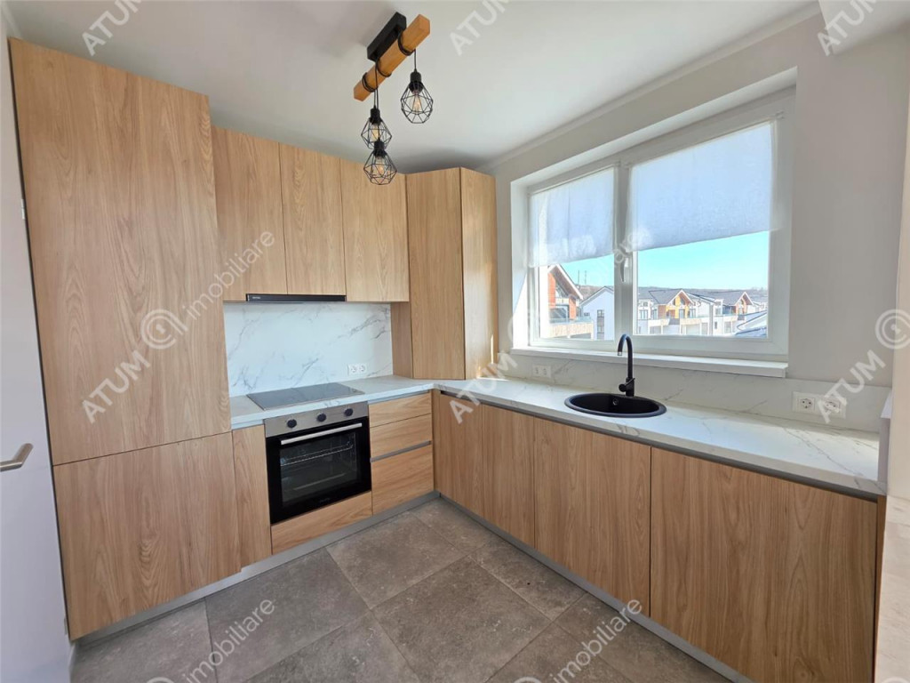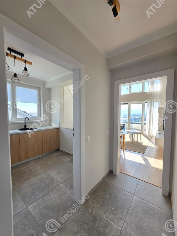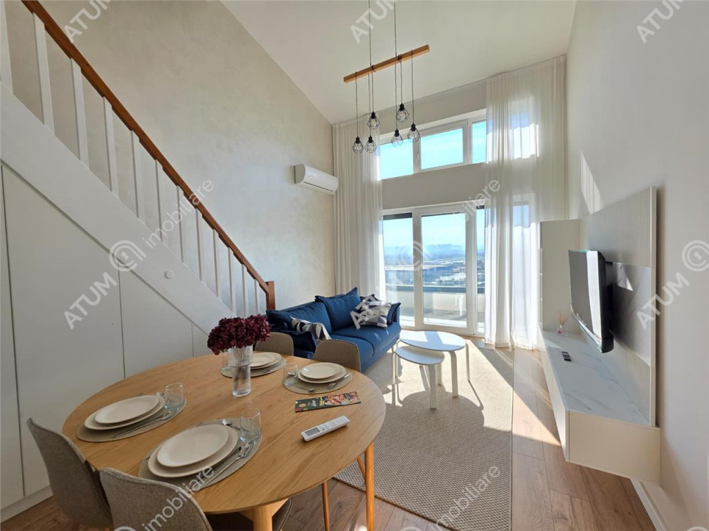 De vanzare in zona Industriala Vest penthouse cu 3 camere decomandate, 2 bai si terasa, orientat catre sud, pozitionat la etajul 2 din 2 al unui bloc tip vila compus din Parter 2Etaje si doar 2 apartamente pe nivel, ce dispune de locuri proprii de parcare, acces securizat, izolatie exterioara si acoperis din tigla. Apartamentul are suprafata utila de 88.5 mp si este compartimentat astfel: La primul nivel regasim un living de 18.4 mp, un dormitor matrimonial de 13 mp, bucatari aproximativ 7 mp, hol generos de 10.5 m, si baie dotata cu cada de 4.7 mp, iar la al doilea nivel intalnim un hol de 1.5 mp, dormitor de 19.5 mp cu dressign de 10.6 mp si baie proprie de 3.3 mp. Separat de suprafata utila, acesta mai beneficiaza si de o Terasa de 7 mp. Apartamentul dispune de multiple spatii pentru depozitare mascate si incorporate. Pe hol se afla un cuier si un spatiu generos pentru depozitare, ambele incastrate in perete. Amenajarile interioare au fost facute in anul 2025, imediat dupa finalizarea constructiei vilei, parchet de 10 mm, usi interioare de lemn, obiecte sanitare, zugraveli in lavabila alba si culori neutre. Penthouse-ul este complet mobilat si utilat cu mobilier de calitate facut pe comanda din MDF si electrocasnice incorporate ( cuptor electric, plita electrica, hota, masina de spalat vase, frigider, masina de spalat rufe, televizoare ). Locuinta dispune de dotari moderne precum usa metalica de acces antiefractie placata cu panou MDF, centrala termica proprie pe gaz cu termostat wireless si incalzire in pardoseala pe ambele nivele, tamplarie PVC cu geam termopan cu 5 camere si 3 foi la nivelul superior geamuri de tip Velux, instalatie electrica din cupru trasa prin coperx cu tablou general si sigurante pentru consumatorii de putere. Inaltimea apartamentului este de 5.6 m. Parcarea se face pe locul propriu amenajat locuintei. Apartamentul este situat intr-o zona cu acces rapid catre centrul orasului Sibiu, oferind icirc;n acelasi timp o priveliste incantatoare asupra imprejurimilor. Valoarea de achizitie este de 181.000 euro TVA inclus, putand fi achizitionat si prin intermediul unui credit bancar. ID intern: 3353.