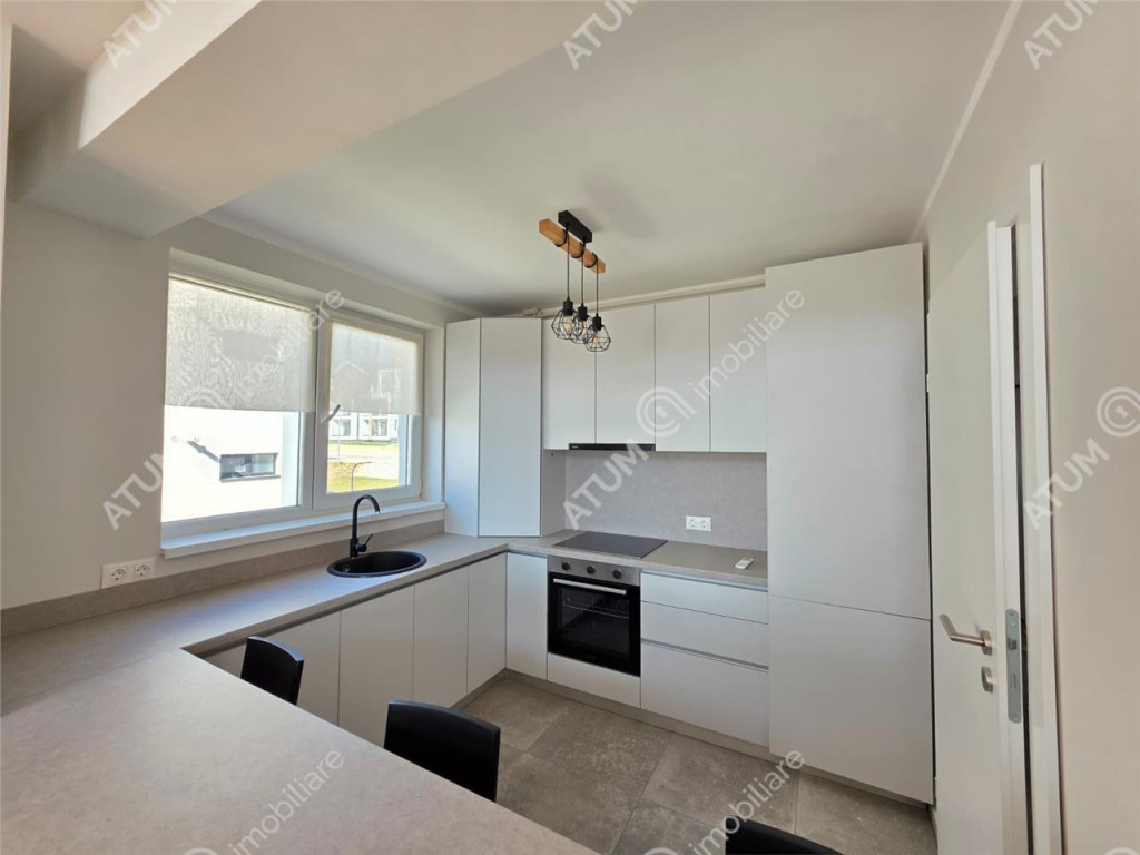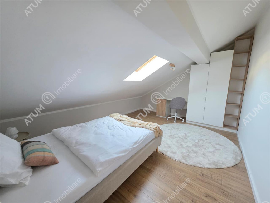 De vanzare in Sibiu penthouse cu 4 camere decomandate, 2 bai si terasa, orientat catre sud, pozitionat la etajul 2 din 2 al unui bloc tip vila compus din Parter 2Etaje si doar 2 apartamente pe nivel, ce dispune de locuri proprii de parcare, acces securizat, izolatie exterioara si acoperis din tigla. Apartamentul are suprafata utila de 103.5 mp si este compartimentat astfel: La primul nivel regasim un living de 19 mp, un dormitor matrimonial de 13.4 mp, bucatarie 8 mp, hol 7 mp, si baie dotata cu cada de 5 mp, iar la al doilea nivel intalnim un hol generos de 9.2 mp, dormitor de 15.5 cu spatiu de depozitare de 6 mp, al doilea dormitor de 12.5 mp si spatiu de depozitare de 5 mp, baie de aproximativ 3 mp. Separat de suprafata utila, acesta mai beneficiaza si de o Terasa de 8 mp. Apartamentul dispune de multiple spatii pentru depozitare mascate si incorporate. Pe hol se afla un cuier si un spatiu generos pentru depozitare, ambele incastrate in perete. Amenajarile interioare au fost facute in anul 2025, imediat dupa finalizarea constructiei vilei, parchet de 10 mm, usi interioare de lemn, obiecte sanitare, zugraveli in lavabila alba si culori neutre. Penthouse-ul este complet mobilat si utilat cu mobilier de calitate facut pe comanda din MDF si electrocasnice incorporate ( cuptor electric, plita electrica, hota, masina de spalat vase, frigider, masina de spalat rufe, televizoare ). Locuinta dispune de dotari moderne precum usa metalica de acces antiefractie placata cu panou MDF, centrala termica proprie pe gaz cu termostat wireless si incalzire in pardoseala pe ambele nivele, tamplarie PVC cu geam termopan cu 5 camere si 3 foi la nivelul superior geamuri de tip Velux, instalatie electrica din cupru trasa prin coperx cu tablou general si sigurante pentru consumatorii de putere. Inaltimea apartamentului este de 5.6 m. Parcarea se face pe locul propriu amenajat locuintei. Apartamentul este situat intr-o zona cu acces rapid catre centrul orasului Sibiu, oferind icirc;n acelasi timp o priveliste incantatoare asupra imprejurimilor. Valoarea de achizitie este de 190.500 euro TVA inclus putand fi achizitionat si prin intermediul unui credit bancar. ID intern: 3351.