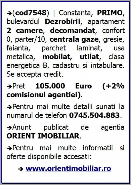 (cod7548) | Constanta, PRIMO, bulevardul Dezrobirii, apartament 2 camere, decomandat, confort 0, parter/10, centrala gaze, gresie, faianta, parchet laminat, usa metalica, mobilat, utilat, clasa energetica B, cadastru si intabulare. Se accepta credit. Pret 105.000 Euro (+2% comisionul agentiei). Pentru mai multe detalii sunati la numarul de telefon 0745.504.883. Anunt publicat de agentia ORIENT IMOBILIAR.