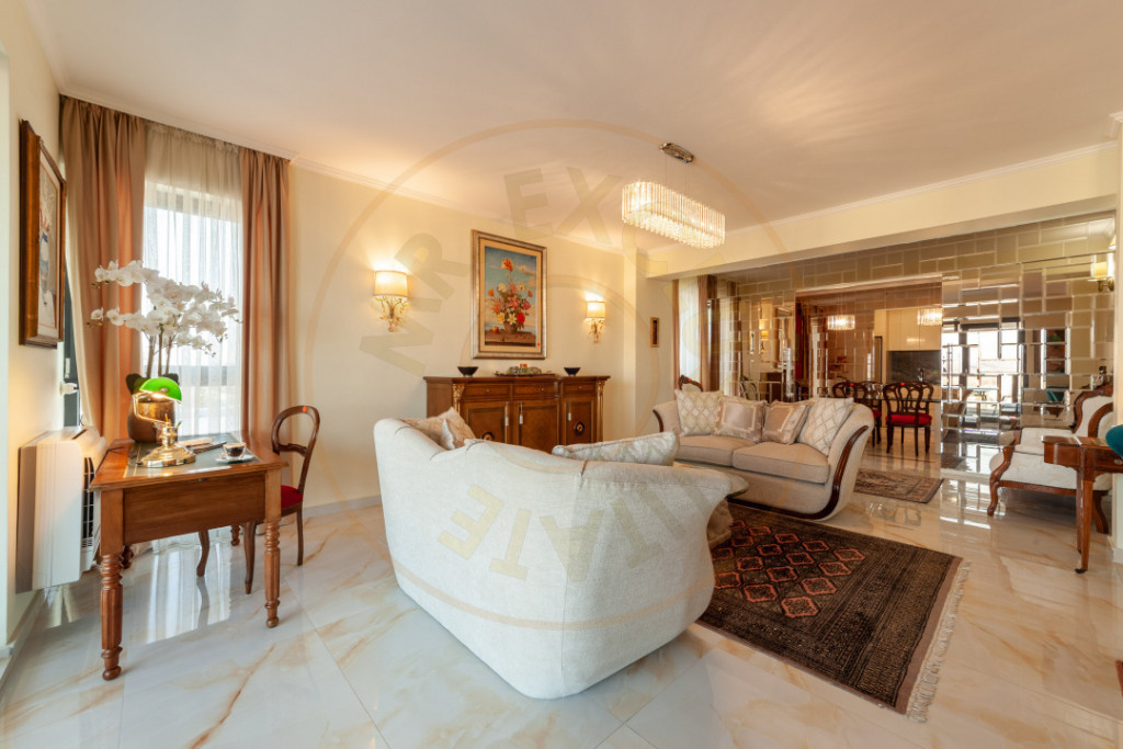 Resedinta urbana premium - apartament ultracentral cu 3 camere, 167 mp, etaj 8/10 + 2 locuri parcare subterana - 15 000 euro / loc parcare Lux, spatiu si panorama - un trophy property care nu concureaza cu nimic din zona! Există apartamente care oferă confort. Și există locuințe care oferă o experiență de viață completă, redefinind ce înseamnă o locuinta premium într-un oraș regional. Cu o suprafata utila totala de 162 mp, apartamentul impresionează prin spațiile largi, luminoase, compartimentarea echilibrată și senzația permanentă de deschidere către oraș, oferită de cele două terase cu priveliste panoramica spectaculoasa. Această reședință ofera 3 camere, 3 băi (Geberit cu sistem de autocuratare), dressing, camera - spalatorie, incalzire prin pardoseala, aer conditionat, videointerfon, senzori de fum si inundatie si amenajare interioară ce îmbină eleganța clasică cu detalii de design modern. Zona de zi este punctul central al locuinței: livingul generos se continua firesc catre dining si bucatarie, delimitat elegant printr-un perete din sticlă care păstrează fluiditatea spațiului și amplifică lumina naturală. Dormitoarele sunt ample și liniștite, oferind intimitate și confort, iar băile sunt finisate cu materiale de calitate superioară, în tonuri elegante și luminoase. Dormitorul matrimonial are baie si terasa proprie. Mobilierul în tonuri calde, covoarele orientale, tablourile vibrante și fotoliile din catifea adaugă o notă de noblețe și rafinament, creând o ambianță aparte,. Fiecare detaliu – de la corpurile de iluminat până la finisajele impecabile – vorbește despre gustul desăvârșit al proprietarilor Totul este complet mobilat si utilat, pregatit pentru mutare imediata. Cele două terase oferă un loc perfect pentru relaxare - se poate admira panorama amplă si spectaculoasa a orașului, dar si crestele muntilor din departare. Apartamentul este situat intr un imobil nou, modern, cu 2 lifturi, videointerfon, izolație termica si fonica, supraveghere video, sistem de alarma si acces auto automat. O locuință aparte, destinată celor care apreciază pozitia, spatiul, eleganta, intimitatea si standardul peste media orasului. Va insotim cu placere sa vizionati acest "acasa" pe care nu l cauti, ci il simti imediat ce l descoperi! Id intern: P8411