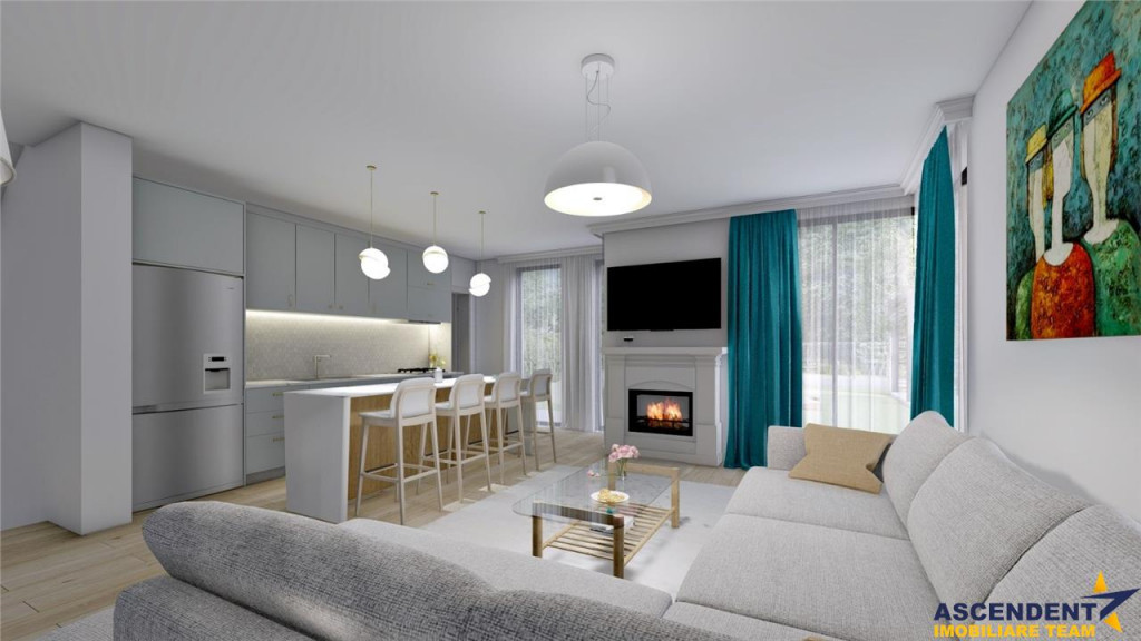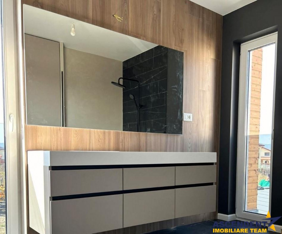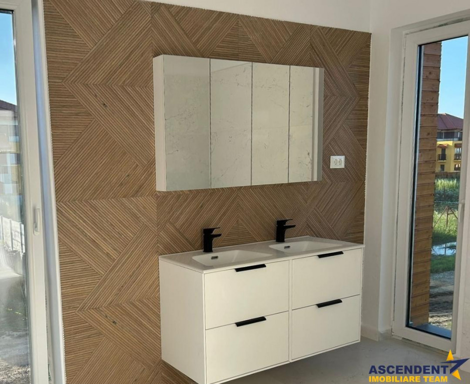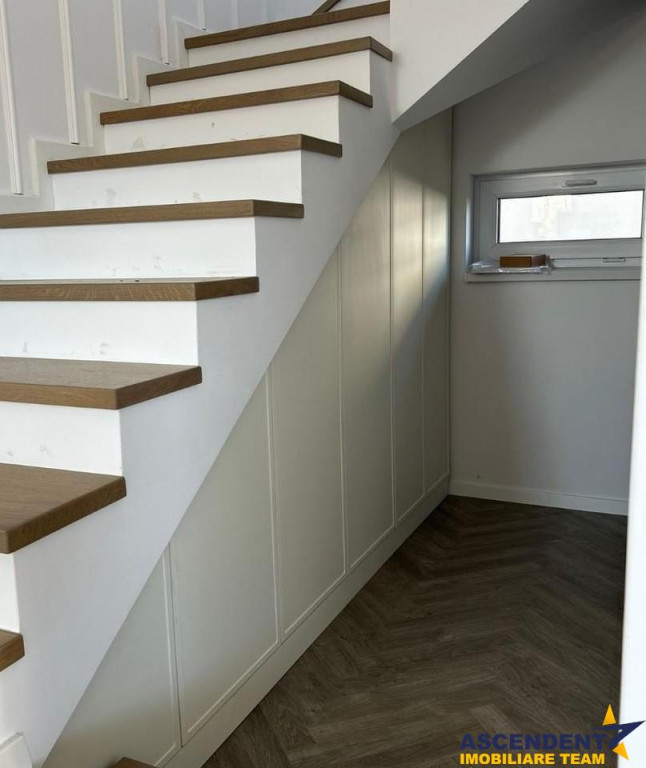 Imobilele valorifica fiecare centimetru patrat din aria utila si se desfasoara pe o compartimentare atractiva, unde la parter avem windfag, baie de serviciu, dressing, spatii de depozitare sub scara, tip sertare, living cu bucatarie si dining, de peste 47 mp si cu iesire pe terasa si scara interioara, placata cu lemn lacuit, balustrada din sticla securizata si mana curenta din lemn, care ne poarta spre etaj unde identificam trei dormitoare, din care unul cu baie proprie, hol si o baie spatioasa.
