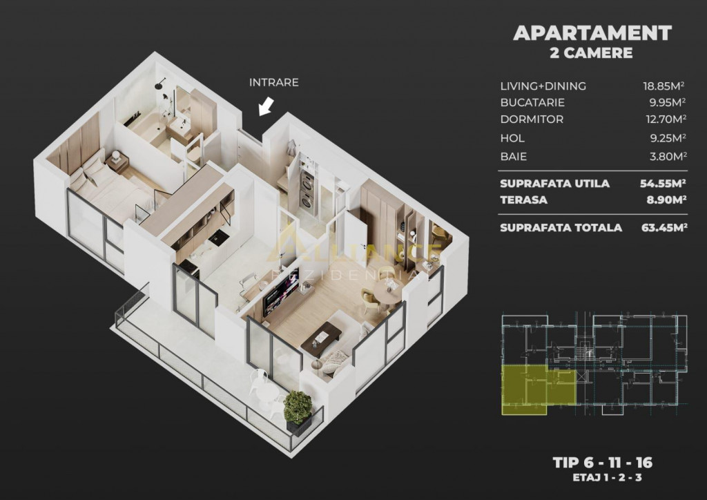 Proiect Nou - Popesti Leordeni - Finalizare Decembrie 2026 Alliance Rezidential va prezinta noul proiect de apartamente situat in Popesti, pe Soseaua Leordeni. Dispune de incalzire prin pardoseala si finisaje premium de cea mai inalta calitate. Lista disponibilitati : Parter: ~ 2 camere tip 2 ndash; 128,95 mp total ndash; 97.934 euro; TVA (118.500 euro;) Etaj 1: ~ 2 camere - 50,65 mp total ndash; 67.769 euro; TVA (82.000 euro; ). ~ 2 camere ndash; 53,25 mp total ndash; 71.074 euro; TVA (86.000 euro;) ~ 2 camere ndash; 63,7 mp total ndash; 82.645 euro; TVA (100.000 euro;) Etaj 4: ~ 2 camere ndash; 43,5 mp utili 37,9 mp terasa ndash; 81,4 mp total ndash; 81.405 euro; TVA (98.500 euro;) ~ 2 camere ndash; 54,8 mp utili 16,9 mp terasa ndash; 71,7 mp total ndash; 88.843 euro; TVA (107.500 euro;) Caracteristici : ~ bloc cu lift ~ incalzire prin pardoseala ~ terase foarte generoase pentru apartamentele superioare ~ fatade moderne Parcare : 5.000 euro TVA Contact: 0747.721.419 Silvia Brutu