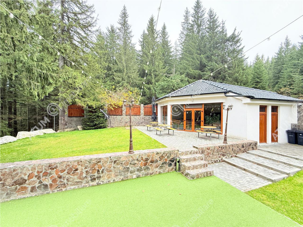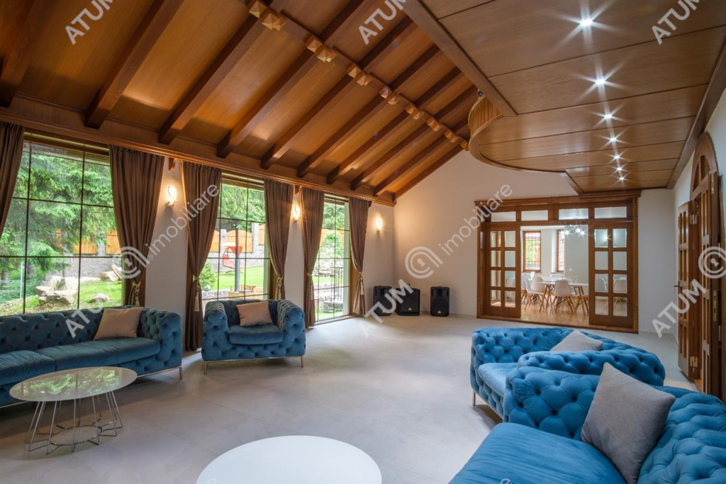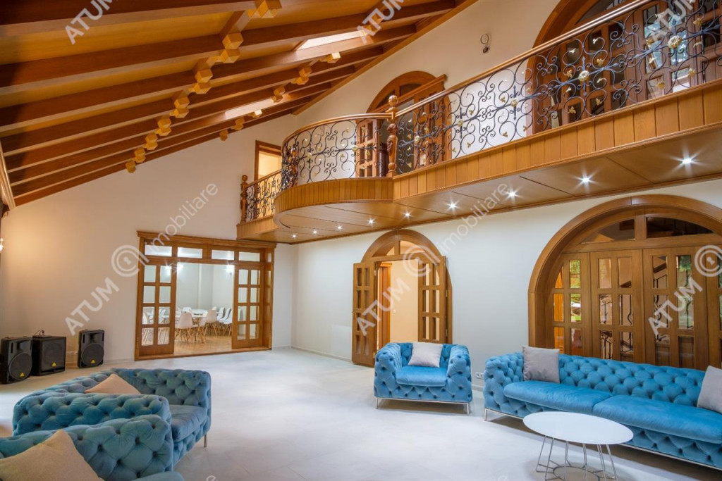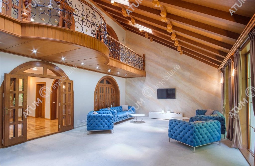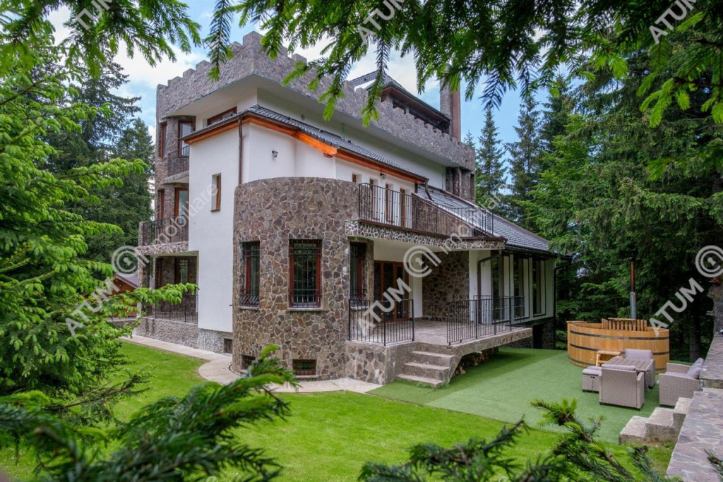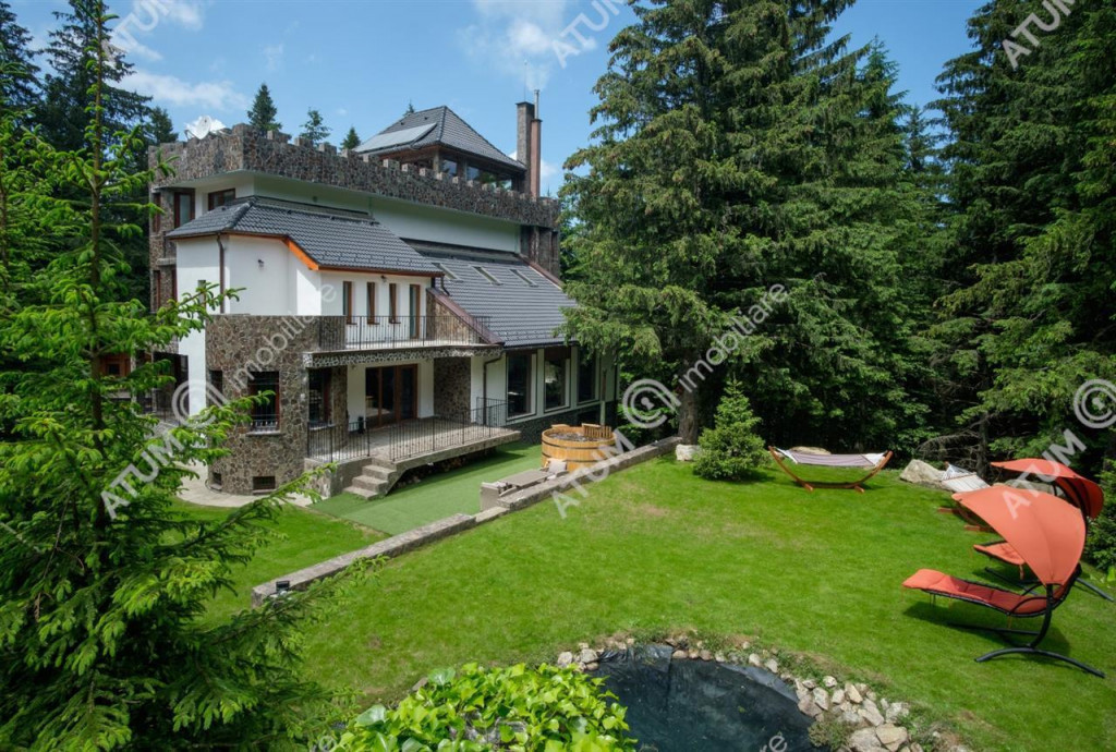 Intr-un cadru natural de o frumusete rara, la doar 30 de minute de Sibiu, se afla una dintre cele mai spectaculoase proprietati private din Romania, o resedinta unica, amplasata in statiunea montana Paltinis, la peste 1.400 de metri altitudine. Pozitionata intr-o zona complet retrasa, inconjurata integral de padure de conifere, proprietatea ofera o intimitate absoluta si o experienta de viata in armonie deplina cu natura. Accesul se face pe drum asfaltat, in conditii excelente, iar odata ajuns, ai senzatia ca ai pasit intr-un colt de lume exclusivist, in care timpul incetineste si linistea devine un lux palpabil. Construita pe un teren generos de 2.700 mp, scos din fondul forestier si incadrat ca teren intravilan, resedinta se remarca printr-o arhitectura spectaculoasa, inspirata din eleganta castelelor montane, cu accente rustice si elemente moderne. Edificata in anul 2005 pe structura solida de beton si placata integral cu piatra cioplita manual, proprietatea a fost complet renovata si modernizata in 2020, la standarde contemporane de confort si rafinament. Fiecare detaliu, de la finisajele din lemn masiv la sticla, piatra naturala si elementele de fier forjat, transmite calitate, rafinament si atentie desavarsita pentru estetica si durabilitate Resedinta se desfasoara pe demisol, parter si trei etaje, avand o suprafata utila de 640 mp si o suprafata construita de 910 mp. Spatiile interioare sunt gandite pentru confort si experienta, fiecare nivel avand o functionalitate distincta: - Demisolul este destinat relaxarii si recreerii, cu o zona SPA completa: piscina interioara (55 mp), jacuzzi, sauna pentru 6 persoane, zona de relaxare, receptie, spatii tehnice si camera de depozitare. - Parterul ofera o zona de zi spectaculoasa: un living generos de 58 mp cu acces pe terasa, o sala de mese eleganta (30 mp), bucatarie complet mobilata si utilata (32 mp), o camera cu baie proprie si doua terase exterioare placate cu piatra naturala. - Etajul 1 cuprinde 4 dormitoare luxoase, fiecare cu baie proprie si balcon, unul dintre ele beneficiind de o terasa privata de 16 mp. - Etajul 2 dispune de 3 dormitoare spatioase, fiecare cu baie si balcon individual. - Etajul 3 gazduieste o incapere vitrata de relaxare cu o vedere panoramica asupra padurii, ce se deschide catre o terasa circulara spectaculoasa de 72 mp, accesibila si prin liftul exterior. Proprietatea beneficiaza de un sistem modern de incalzire cu centrala pe lemne/peleti cu incarcare automata, doua pufare mari, doua boilere, pompa de caldura pentru zona SPA si panouri solare. Parterul este incalzit prin pardoseala, iar restul cladirii prin calorifere din otel si sistem de climatizare. Toate camerele sunt mobilate cu piese de mobilier de calitate superioara, tamplarie si usi din lemn masiv, iar baile sunt complet echipate si finisate cu materiale premium. Pe langa corpul principal, proprietatea include o cladire secundara de 100 mp utili, compusa din 4 dormitoare, 2 bai, o camera de zi, spatiu tehnic si garaj de 22 mp. In curte se afla si un foisor inchis, complet echipat pentru petreceri private ( cuptor pentru pizza, gratar pe lemne, plita pe lemne si plita electrica ). Exteriorul este un adevarat paradis natural: Terenul de 2.700 mp este complet amenajat cu gazon si sistem de irigatie automat, alei pavate, gard din piatra si lemn, iluminat ambiental, ciubar pentru 12 persoane, zona BBQ si spatiu de joaca. Totul este gandit pentru confort, relaxare si intimitate absoluta, intr-un ca