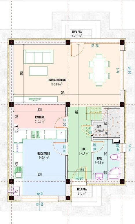 Parter: Living + dining, bucătărie închisă, casa scării, grup sanitar, spațiu de depozitare subteran /crama ,camera tehnica pt centrala si masina de spalat , terasă cu acces din living