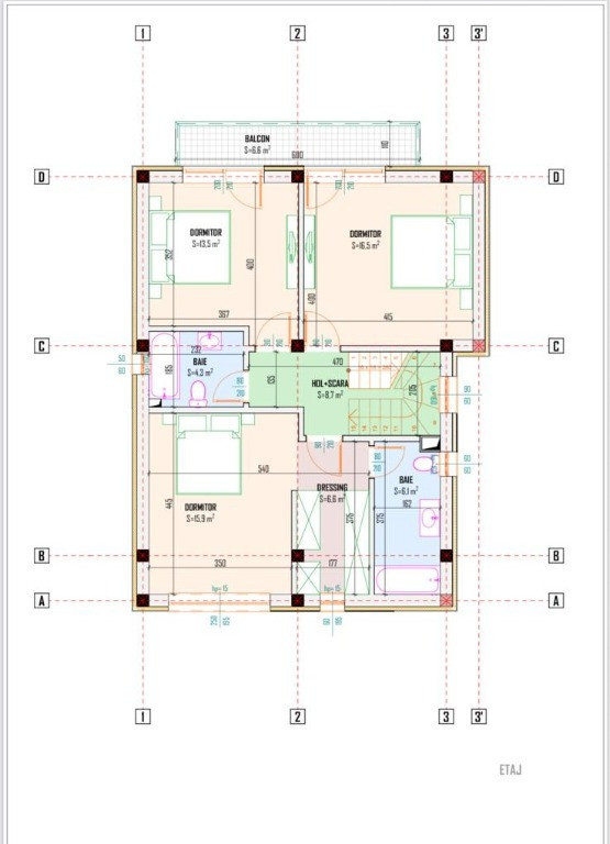 Etaj: 3 dormitoare, dintre care unul cu baie proprie și dressing, hol + casă scării, baie cu cada,2 dormitoare cu balcon .