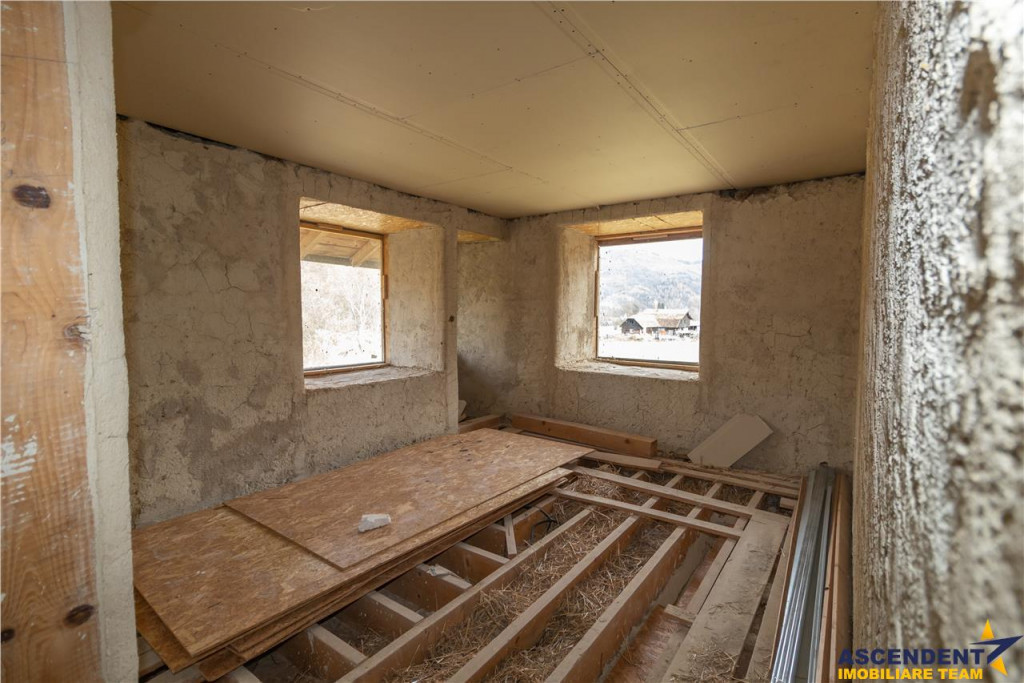 Comision cumparator:0% ASCENDENT IMOBILIARE este onorata sa va propuna spre vanzare o proprietate distinctiva, amplasata in inima naturii, in pitorescul Moeciu de Jos, la doar 2 km de Castelul Bran ndash; una dintre cele mai vizitate atractii turistice din Romania. Va invitam sa experimentati o vizionare initiala, din locatia unde va aflati, chiar acum, prin accesarea filmului de prezentare: https://www.youtube.com/watch?v=n8Rgwg3usN0 Aceasta casa cu teren de 900 mp a fost gandita in spiritul unei quot;Case Verziquot;, respectand principiile constructiilor ecologice si naturale. Peretii masivi, de aproximativ 1 metru grosime, sunt realizati dintr-un amestec de lut si paie, oferind o izolatie naturala pretioasa, completata de lana de oaie ndash; un material pur si sustenabil, care creeaza un confort termic remarcabil in orice anotimp. Imobilul are o compartimentare personalizata si este neintabulat. La parter se afla un living primitor, o camera, o baie, o bucatarie, un hol si o debara, aflate in stadiu partial finalizat. Etajul ofera doua camere mai mici, dintre care una aproape finalizata cu baie proprie, precum si patru camere suplimentare prevazute cu bai si balcoane ndash; ideale pentru transformarea casei intr-o pensiune de tip boutique sau intr-un refugiu montan pentru familie si prieteni. Proprietatea beneficiaza de o priveliste spectaculoasa asupra muntilor, iar prin fata terenului trece paraul Turcul, adaugand un farmec aparte atmosferei rustice. In interior se gasesc deja multe materiale de calitate ndash; parchet, gresie, lana, mobilier ndash; care asteapta sa fie montate de noul proprietar, oferind libertatea de a finaliza locuinta dupa propriul gust. Zona Moeciu de Jos este recunoscuta pentru peisajele sale idilice, pentru aerul curat de munte si pentru proximitatea fata de principalele puncte turistice din zona Bran ndash; Fundata ndash; Cheile Gradistei. In apropiere se afla numeroase unitati de cazare si pensiuni, ceea ce face din aceasta proprietate o oportunitate ideala atat pentru locuinta de vacanta, cat si pentru dezvoltarea unei afaceri turistice. Aici natura, linistea si autenticitatea se imbina si cu potentialul de investitie ndash; o alegere pentru cei care viseaza la o viata in ritm cu natura, la poalele muntilor. Consilier dedicat alesei oferte: doamna Gabriela Petrescu Telefon/ WhatsApp: 0741 221 323 Detalii, fotografii suplimentare si alte oferte similare exclusive: www.ascendentimobiliare.ro