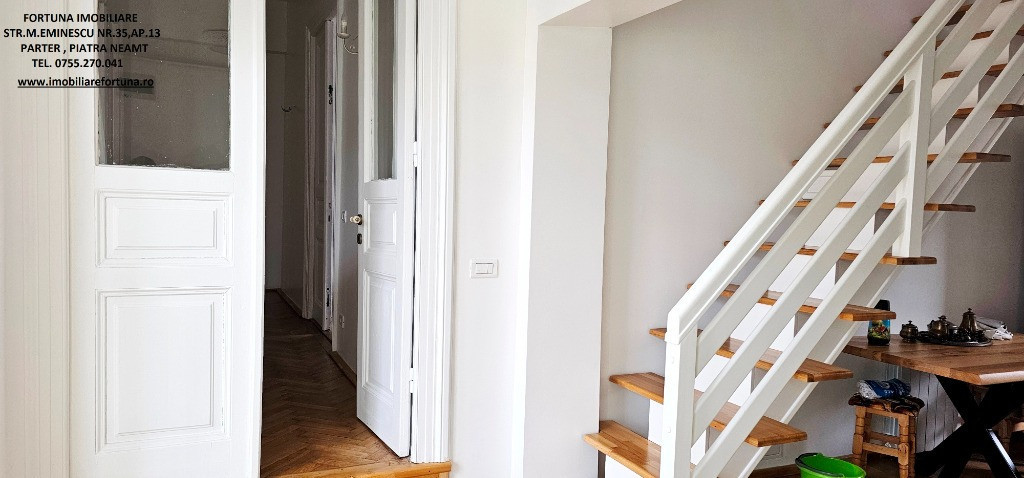 PROPRIETATE IMOBILIARĂ DE EXCEPȚIE SITUATĂ ÎN ANSAMBLU REZIDENȚIAL ULTRACENTRAL - STRADA STEFAN CEL MARE, 170.000 EURO FORTUNA IMOBILIARE este onorată să vă prezinte spre achiziționare această proprietate, care dispune de o poziție privilegiată în municipiul Piatra Neamț și se remarcă prin noblețe și eleganță arhitecturală, îmbinând rafinamentul epocii cu modernismul contemporan. Imobilul este compus din suprafața de 124 mp teren și corp locuință cu regim de înălțime P+M, cu amprenta la sol de 103 mp, fiind construit pe fundații din beton armat, zidărie din cărămidă roșie plină cu grosimea de 70 cm, acoperiș din tablă titan-zinc RHEINZINK, ce conferă durabilitate și rezistență la coroziune. Este renovat în totalitate în 2024, având toate instalațiile (electrică, termică și sanitară) noi. Casa este compusă din antreu, baie, bucătărie ( echipată complet cu electrocasnice de ultima generație, filtru de apă, dușumea de stejar etc. ) cu ieșire într-o mica curticică, hol, 2 dormitoare generoase și luminoase, iar la mansardă avem o baie mare, terasă însorită și un spațiu generos de pod, pe toata suprafața casei, prevăzut cu 3 iluminatoare / ferestre Velux, izolat, ce poate fi amenajat ca spațiu locuibil/de agrement. Casa beneficiază de toate utilitățile ( apă, curent, gaz, canalizare ). Este prevăzută cu centrală termică pe gaz metan și calorifere calibrate pe fiecare încăpere, oferind un confort locuibil și eficiență energetică reflectată în costurile mici de întreținere. În fața casei regăsim o mică curte, pavată cu piatră, ce poate fi folosită pentru a parca mașina familiei. Terenul este plan, împrejmuit cu gard nou din lamele, pe fundație din piatră zidită. Ca principale beneficii, imobilul se află într-o zonă rezidențială selectă, păstrează esența unui design arhitectural remarcabil și aerul boem al vremurilor de odinioară. Oferă echilibru între job și viața personală/de familie, întrucât permite o ușoară accesibilitate către serviciu, instituții educaționale/medicale, centre comerciale/culturale, spații de recreere și pentru petrecerea timpului liber, alte obiective de interes.. Preț 170.000 euro Pentru o prezentare detaliată a acestei oferte, furnizarea unor informații suplimentare referitoare la situația juridică / identificarea imobilului și programarea unei vizionări, vă invităm la sediul nostru, Fortuna Imobiliare, situat pe str. M. Eminescu, nr. 35, ap. 13, parter, lângă fostul Tribunal, tel. contact 0755.270.041. Your comfort is our priority ! Oferta noastră completă o găsiți aici: https://imobiliarefortuna.ro/