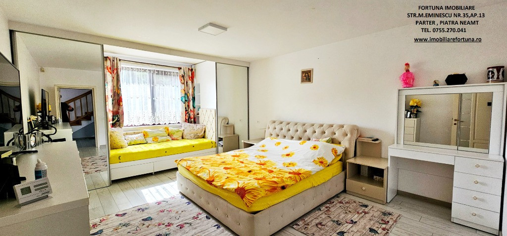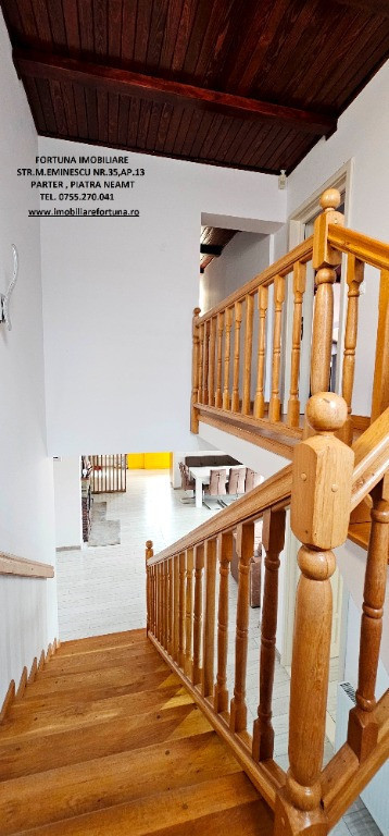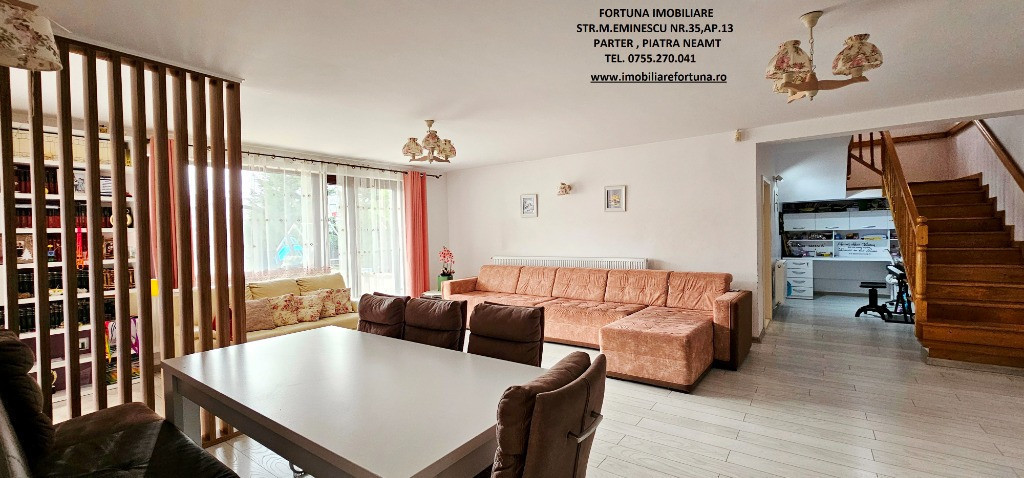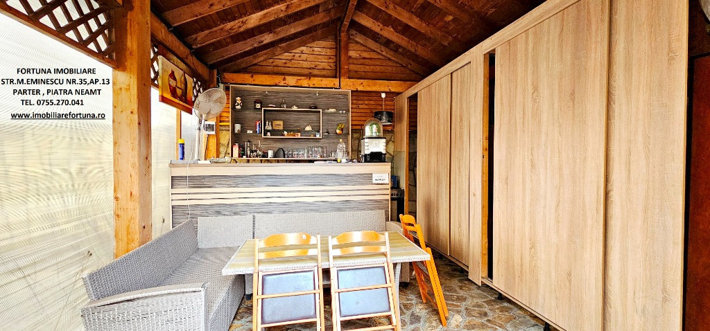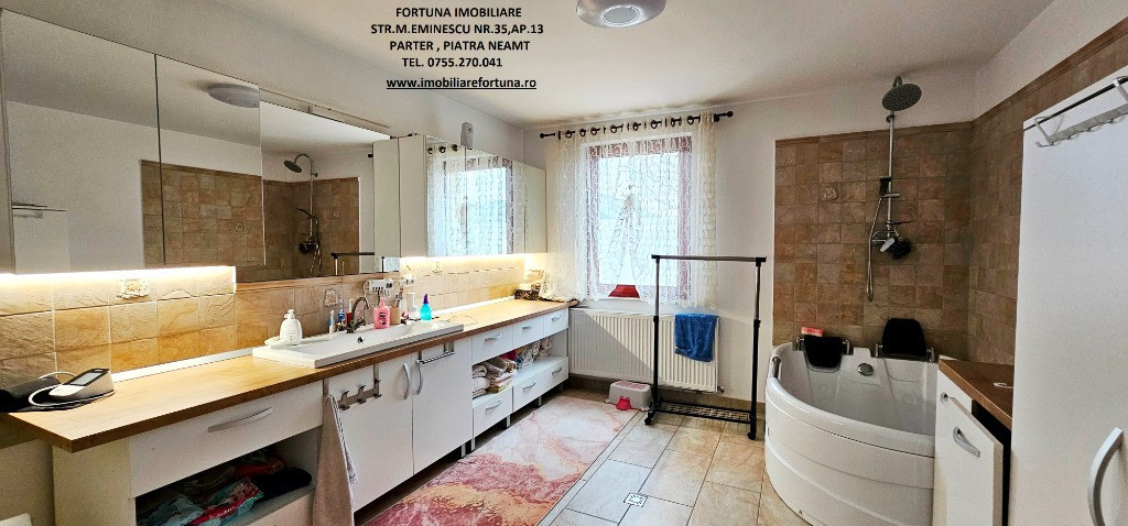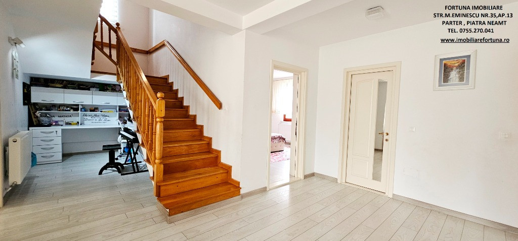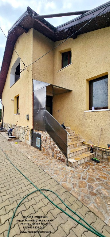 PROPRIETATE DE EXCEPȚIE, OAZĂ DE CONFORT ȘI VIBE „DE ACASĂ” – VILĂ MOBILATĂ ȘI UTILATĂ, PLUS ANEXĂ ȘI TEREN, ÎN MUN. PIATRA NEAMȚ, 340.000 EURO Pentru cei care doresc să se bucure de facilitățile urbane, beneficiind totodată de liniște, verde și aer curat, FORTUNA IMOBILIARE propune spre achiziție această proprietate elegantă, îngrijită, primitoare, compusă din locuință, anexă și teren, situată într-o zonă liniștită, cu un view atractiv, din intravilanul Municipiului Piatra Neamț. Proprietatea este compusă din suprafața totală de 1.104 mp teren, pe care este edificată o casă cu regim de înălțime P+M, cu suprafața construită la sol de 171,18 mp, suprafața utilă desfășurată de 265,33 mp ( suprafața utilă + terasă + balcon = 306,04 mp ), pe fundații din beton armat, zidărie din cărămidă, acoperită cu tablă profilată tip Lindab, prevăzută cu termosistem dublu, ferestre de termopan, uși interioare din lemn masiv, parchet, gresie, faianță etc. Casa este compartimentată astfel: ***Parterul oferă o zonă de locuit deschisă și dinamică: terasă mare acoperită, hol, baie (cu aerisire naturală), bucătărie generoasă, două dormitoare, dressing amenajat cu rafturi pentru haine și un living ( cu un șemineu pe lemne prevăzut cu difuzoare de căldură ) ce oferă spațiu suficient și confortabil pentru primirea și petrecerea timpului liber alături de cei dragi. ***Mansarda este compusă din: hol, 3 dormitoare mari cu ferestre termopan vitrate mari, completate cu ferestre tip Velux, ce adaugă un plus de lumină naturală, confort termic și vizual, un balcon mare tip terasă (cu ieșire dintr-un dormitor și din hol) de unde puteți contempla priveliștea, dressing și o baie foarte generoasă. ***Podul casei este izolat cu spumă și vată bazaltică, putând fi amenajat, dacă se dorește, după gusturi și nevoi. ***Planșeul dintre parter, mansardă și scara interioară sunt construite din beton armat, ceea ce asigură casei o rezistență crescută și siguranță în exploatare. Scara interioara este placată cu lemn masiv de stejar. Casa oferă un mod de viață relaxant si sănătos, fiind mobilată și decorată cu gust și suflet, fiind ideală pentru o familie cu mai mulți copii. Se remarcă printr-o configurație și o compartimentare inteligentă, ce îmbină stilul modernist cu confortul vremurilor contemporane. Proprietatea deține o anexă gospodărească - un foișor închis echipat complet - o zona de barbeque și minibar, pentru petrecerea timpului liber cu cei dragi, precum și o curte generoasă și minuțios amenajată, organizată cu alei cu pavele, 2 locuri de parcare, gazon, arbuști, plante ornamentale, tuia, o multitudine de flori, loc de joacă pentru copii, oferind suficient spațiu pentru a crea o atmosferă de relaxare în aer liber. Aceasta este împrejmuită cu gard solid cu temelie și elevație din beton armat. Ansamblul rezidențial beneficiază de sistem de supraveghere video, sistem de alarmare, închidere centralizată a porților, rețelistică internet/tv/telefonie și este conectat la toate utilitățile ( apă, curent, gaz metan ). Locuința se vinde complet mobilată și utilată, așa cum este prezentată în fotografii, facilitând o mutare imediată. Preț 340.000 euro . Pentru o prezentare detaliată a acestei oferte, furnizarea unor informații suplimentare referitoare la situația juridică / identificarea imobilului și programarea unei vizionări, vă invităm la sediul nostru, Fortuna Imobiliare, situat pe str. M. Eminescu, nr. 35, ap. 13, parter, lângă fostul Tribunal, tel. contact 0755.270.041. Your comfort is our priority ! Oferta noastră completă o găsiți aici: https://imobiliarefortuna.ro/