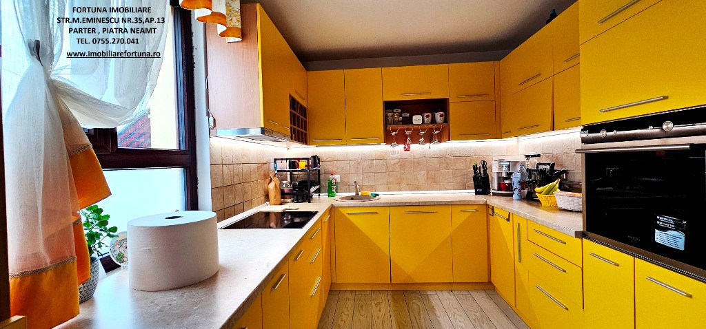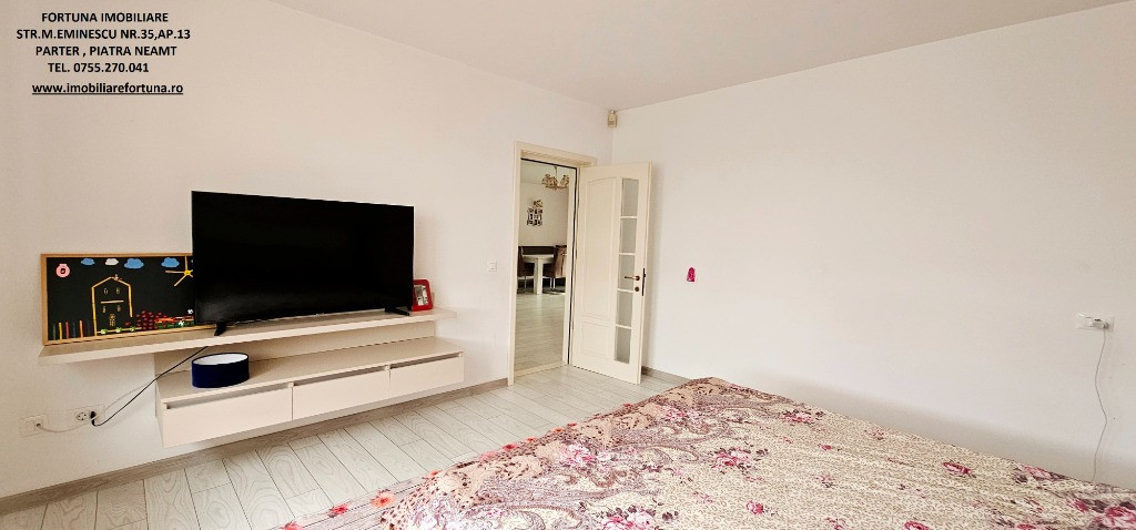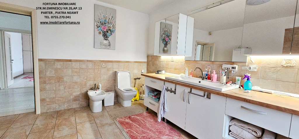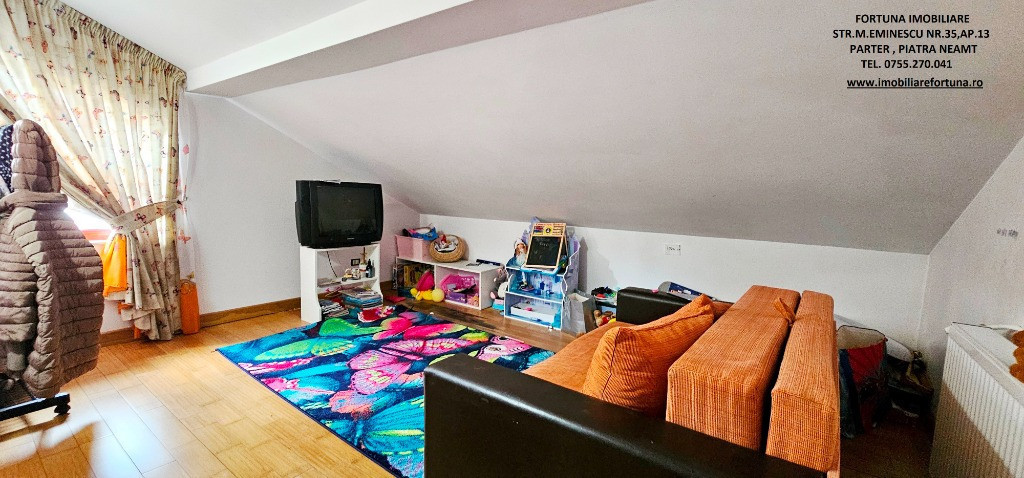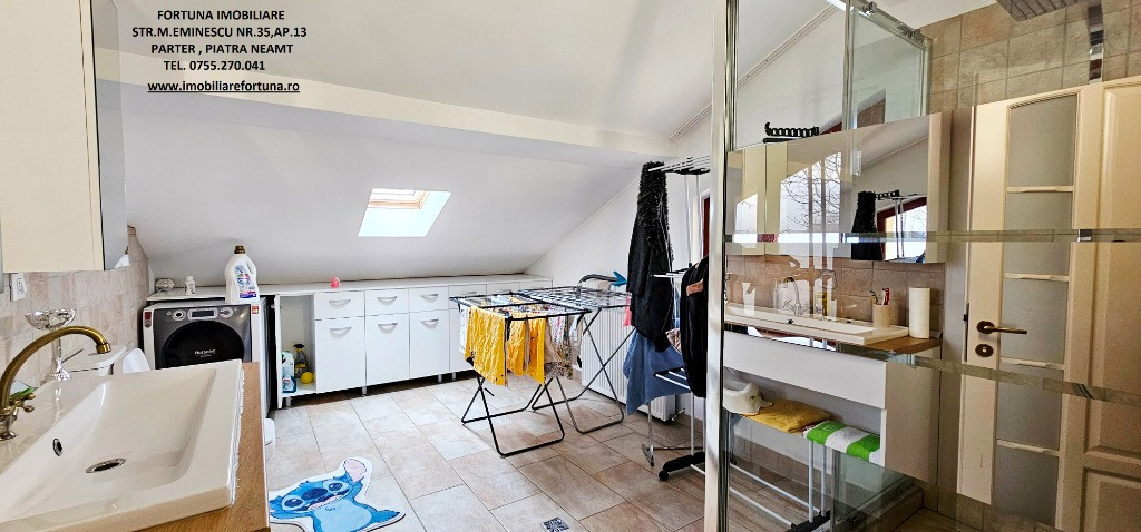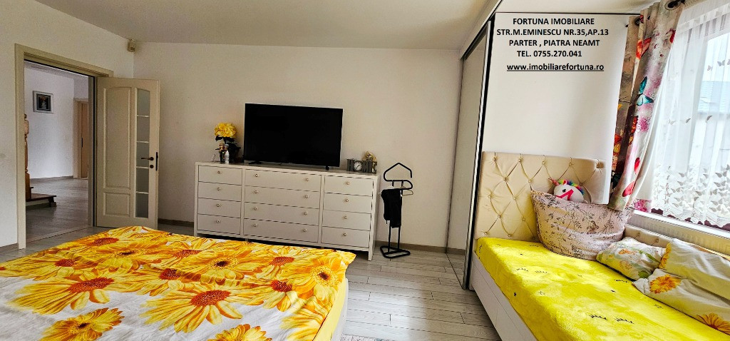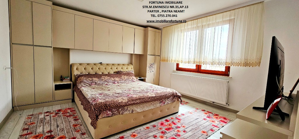 PROPRIETATE DE EXCEPȚIE, OAZĂ DE CONFORT ȘI VIBE „DE ACASĂ” – VILĂ MOBILATĂ ȘI UTILATĂ, PLUS ANEXĂ ȘI TEREN, ÎN MUN. PIATRA NEAMȚ, 340.000 EURO Pentru cei care doresc să se bucure de facilitățile urbane, beneficiind totodată de liniște, verde și aer curat, FORTUNA IMOBILIARE propune spre achiziție această proprietate elegantă, îngrijită, primitoare, compusă din locuință, anexă și teren, situată într-o zonă liniștită, cu un view atractiv, din intravilanul Municipiului Piatra Neamț. Proprietatea este compusă din suprafața totală de 1.104 mp teren, pe care este edificată o casă cu regim de înălțime P+M, cu suprafața construită la sol de 171,18 mp, suprafața utilă desfășurată de 265,33 mp ( suprafața utilă + terasă + balcon = 306,04 mp ), pe fundații din beton armat, zidărie din cărămidă, acoperită cu tablă profilată tip Lindab, prevăzută cu termosistem dublu, ferestre de termopan, uși interioare din lemn masiv, parchet, gresie, faianță etc. Casa este compartimentată astfel: ***Parterul oferă o zonă de locuit deschisă și dinamică: terasă mare acoperită, hol, baie (cu aerisire naturală), bucătărie generoasă, două dormitoare, dressing amenajat cu rafturi pentru haine și un living ( cu un șemineu pe lemne prevăzut cu difuzoare de căldură ) ce oferă spațiu suficient și confortabil pentru primirea și petrecerea timpului liber alături de cei dragi. ***Mansarda este compusă din: hol, 3 dormitoare mari cu ferestre termopan vitrate mari, completate cu ferestre tip Velux, ce adaugă un plus de lumină naturală, confort termic și vizual, un balcon mare tip terasă (cu ieșire dintr-un dormitor și din hol) de unde puteți contempla priveliștea, dressing și o baie foarte generoasă. ***Podul casei este izolat cu spumă și vată bazaltică, putând fi amenajat, dacă se dorește, după gusturi și nevoi. ***Planșeul dintre parter, mansardă și scara interioară sunt construite din beton armat, ceea ce asigură casei o rezistență crescută și siguranță în exploatare. Scara interioara este placată cu lemn masiv de stejar. Casa oferă un mod de viață relaxant si sănătos, fiind mobilată și decorată cu gust și suflet, fiind ideală pentru o familie cu mai mulți copii. Se remarcă printr-o configurație și o compartimentare inteligentă, ce îmbină stilul modernist cu confortul vremurilor contemporane. Proprietatea deține o anexă gospodărească - un foișor închis echipat complet - o zona de barbeque și minibar, pentru petrecerea timpului liber cu cei dragi, precum și o curte generoasă și minuțios amenajată, organizată cu alei cu pavele, 2 locuri de parcare, gazon, arbuști, plante ornamentale, tuia, o multitudine de flori, loc de joacă pentru copii, oferind suficient spațiu pentru a crea o atmosferă de relaxare în aer liber. Aceasta este împrejmuită cu gard solid cu temelie și elevație din beton armat. Ansamblul rezidențial beneficiază de sistem de supraveghere video, sistem de alarmare, închidere centralizată a porților, rețelistică internet/tv/telefonie și este conectat la toate utilitățile ( apă, curent, gaz metan ). Locuința se vinde complet mobilată și utilată, așa cum este prezentată în fotografii, facilitând o mutare imediată. Preț 340.000 euro . Pentru o prezentare detaliată a acestei oferte, furnizarea unor informații suplimentare referitoare la situația juridică / identificarea imobilului și programarea unei vizionări, vă invităm la sediul nostru, Fortuna Imobiliare, situat pe str. M. Eminescu, nr. 35, ap. 13, parter, lângă fostul Tribunal, tel. contact 0755.270.041. Your comfort is our priority ! Oferta noastră completă o găsiți aici: https://imobiliarefortuna.ro/