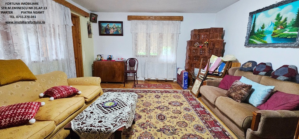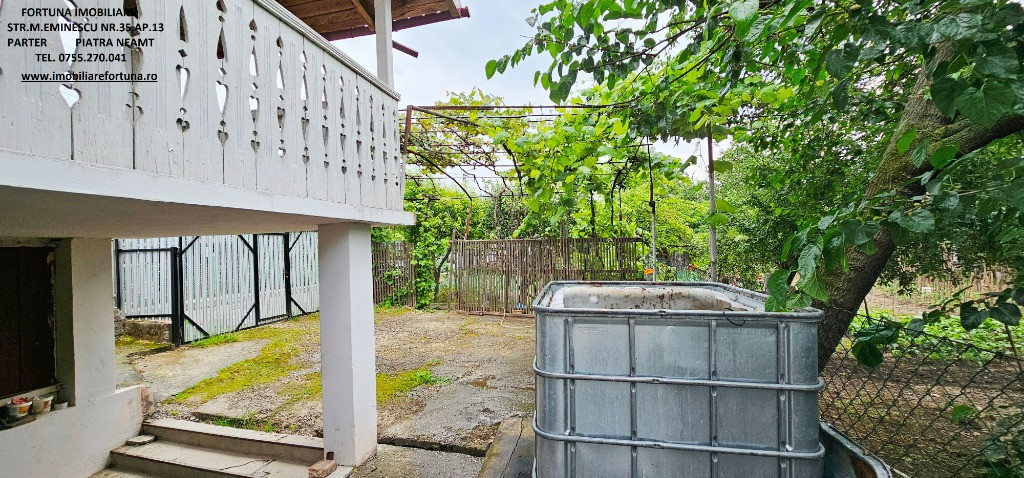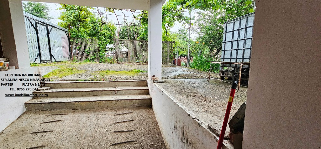 PROPRIETATE SITUATĂ ÎN INTRAVILANUL MUN. PIATRA NEAMȚ, ZONA CINDIA, 68.500 EURO FORTUNA IMOBILIARE vă oferă spre vânzare un imobil compus din suprafața de300 mp teren, pe care este edificată o casă S+P,cu suprafața construită și măsurată la sol de 86 mp, suprafața desfășurată de 172 mp, construită în anii 1990 pe fundații din beton armat, zidărie din cărămidă, acoperită cu tablă tip Lindab, compartimentata astfel : La subsol : garaj, camera centralei, pivniță și ateliere. La parter : hol, cameră de zi cu ieșire în balcon și terasă, 2 dormitoare, baie și bucătărie. Casa beneficiază de termosistem exterior integral, este conectată la rețeaua publică de electricitate, prevăzută cu hidrofor pentru apa curentă, iar încălzirea se face prin intermediul centralei pe lemne ( sunt calorifere și sobe de teracota funcționale în fiecare cameră ). Terenul este împrejmuit cu gard metalic și are o forma geometrică regulată.Este amenajat cu flori, gazon, pomi, viță de vie și zonă de zarzavat. Preț 68.500 euro. Pentru o prezentare detaliată a acestei oferte, furnizarea unor informații suplimentare referitoare la situația juridică / identificarea imobilului și programarea unei vizionări, vă invităm la sediul nostru, Fortuna Imobiliare, situat pe str. M. Eminescu, nr. 35, ap. 13, parter, lângă fostul Tribunal, tel. contact 0755.270.041. Your comfort is our priority ! Oferta noastră completă o găsiți aici: https://imobiliarefortuna.ro/