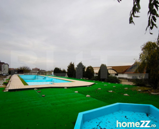 Piscina de 426 mp, concepută ca ștrand, este integrată într-un spațiu exterior amplu, cu: alei pavate și suprafețe generoase pentru șezlonguri; vestiare și dușuri;