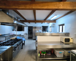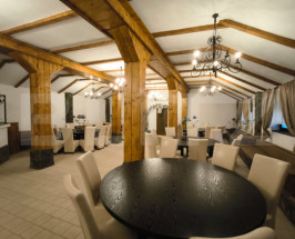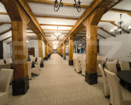 -Sala principală (644 mp utili) impresionează prin: structură solidă cu grinzi masive din lemn și accente din piatră naturală;