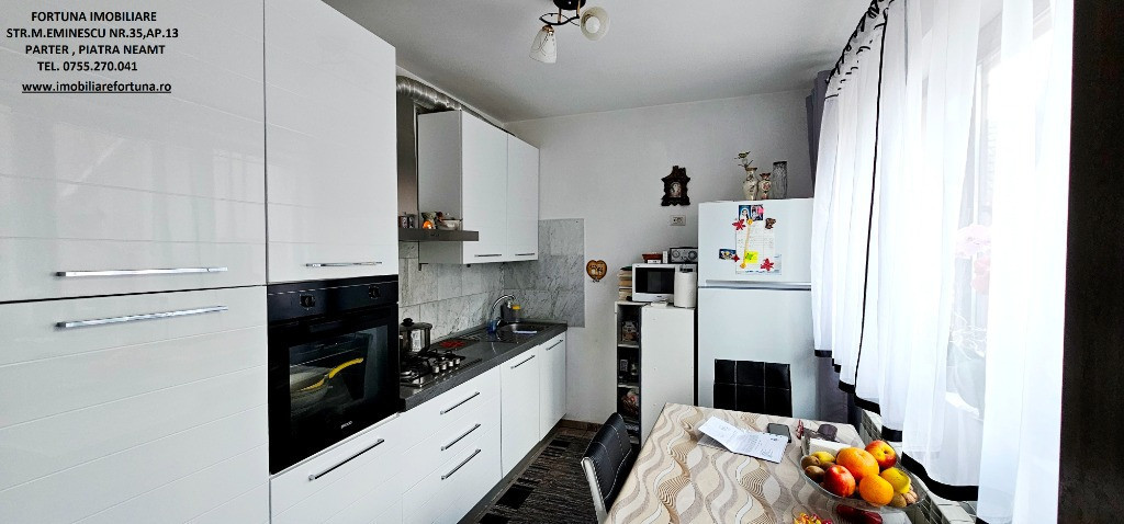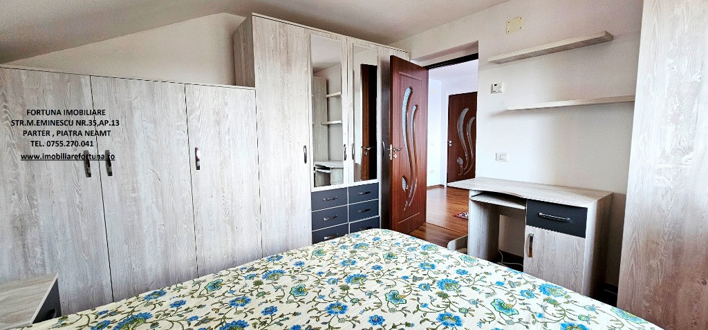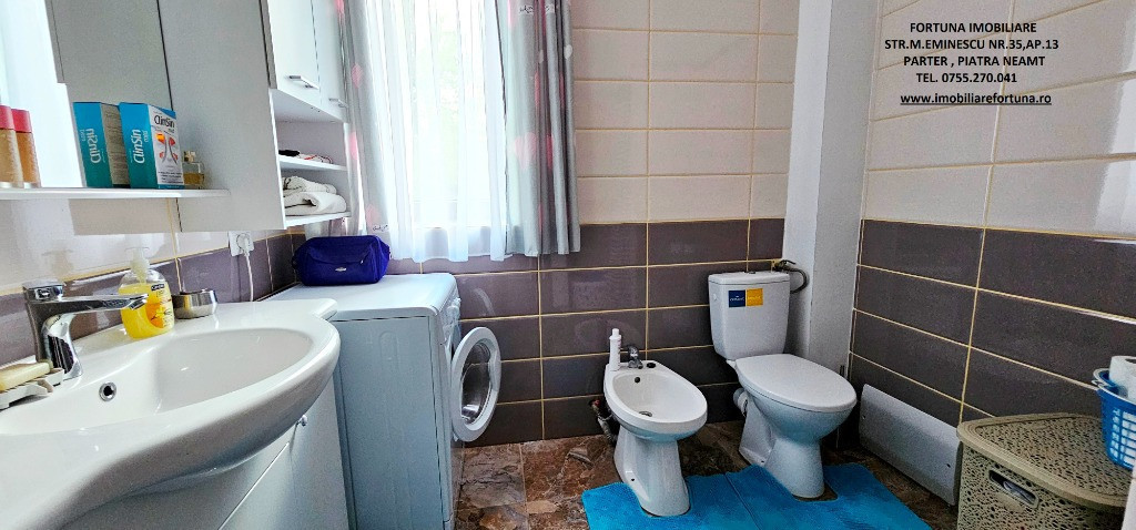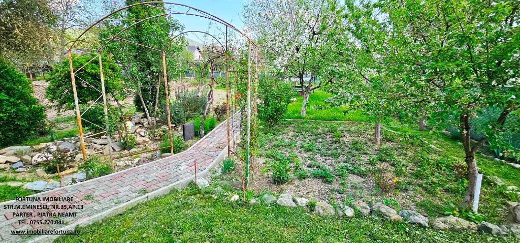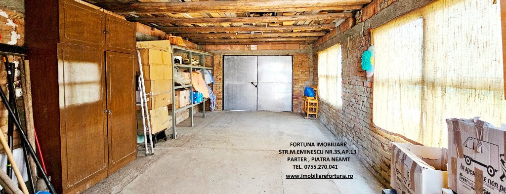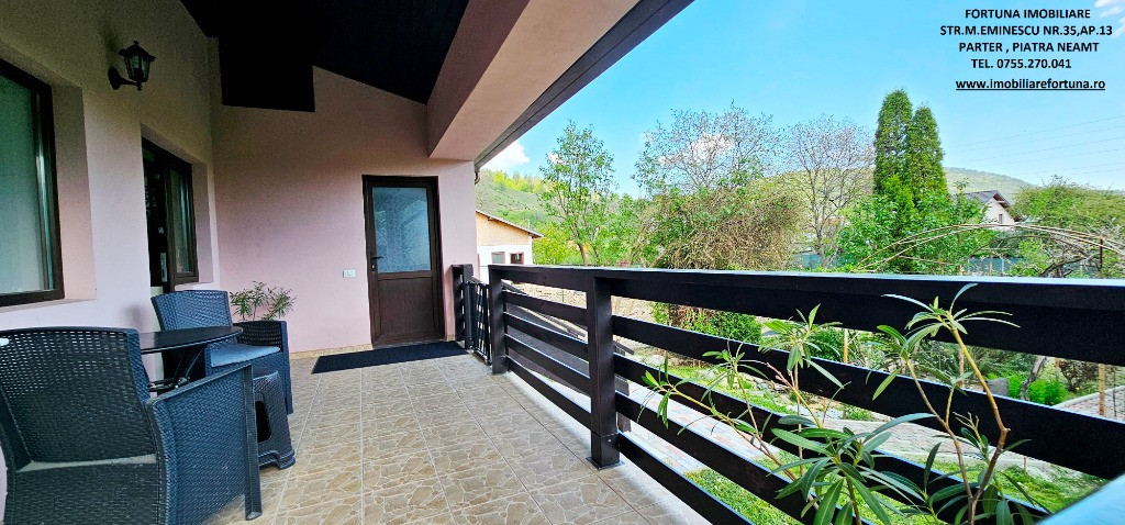 PROPRIETATE PIATRA NEAMT – VILĂ COCHETĂ, PREVĂZUTĂ CU GARAJ, BECI ȘI TEREN, ÎN CADRU MIRIFIC, 255.000 EURO NEG Pentru cei care doresc să se bucure de facilitățile urbane, beneficiind totodată de liniște, verde și aer curat, FORTUNA IMOBILIARE propune spre achiziție această proprietate elegantă, îngrijită, primitoare, compusă din locuință, garaj și teren, situată într-o zonă liniștită, cu un view atractiv, din intravilanul Municipiului Piatra Neamț. Proprietatea este compusă din suprafața totală de 760 mp teren, pe care este edificată (an finalizare 2017) o casă cu regim de înălțime S+P+M, cu suprafața construită la sol de 99 mp, suprafața desfășurată de 195 mp, pe fundații din beton armat, zidărie din cărămidă porotherm, acoperită cu tablă profilată tip Lindab, prevăzută cu termosistem exterior integral de 10 cm, ferestre de termopan, parchet, gresie, faianță etc. Casa este compartimentată astfel: ***Subsolul asigură accesibilitate din casă fiind constituit din beci mare, betonat, ce permite depozitarea si pastrarea in conditii excelente a conservelor si alimentelor. . ***Parterul oferă o zonă de locuit deschisă și dinamică: Hol, baie (cu aerisire naturală), bucătărie, un dormitor generos și un living ce oferă spațiu suficient și confortabil pentru primirea și petrecerea timpului liber alături de cei dragi.Livingul are ieșire într-o terasa mare, acoperita, unde puteți savura în liniște cafeaua în orice anotimp. Tot la parter avem camera tehnică unde este instalată centrala pe gaz (conectată la rețeaua de calorifere calibrate pe fiecare cameră), ce asigură eficiență termică ridicată pentru întreaga casă. ***Mansarda este compusa din: living cu ferestre termopan vitrate mari, 2 dormitoare mari, baie si un balcon ( cu ieșire din living ) de unde puteți contempla priveliștea superba. ***Ambele planșee ( dintre subsol, parter si mansarda ) sunt construite din beton armat , ceea ce asigură casei o rezistență crescută și siguranță în exploatare. Casa oferă un mod de viață relaxant si sănătos, fiind mobilată și decorată cu gust și suflet, fiind ideală pentru o familie iubitoare de liniste si natura. Se remarcă printr-o configurație și o compartimentare inteligentă, ce îmbină stilul pragmatic cu confortul vremurilor contemporane. Proprietatea deține un garaj construit din caramida pe fundatii din beton armat, acoperit cu tabla profilata tip Lindab, cu suprafata de 32 mp si oferă nu doar eleganță și confort la interior, ci și o curte frumos amenajată, organizată cu alei, gazon, flori, arbuști si plante ornamentale, loc de joacă pentru copii ( leagăn ), vita de vie, pomi fructiferi pe rod ( ciresi, visini, pruni, nuc, cais, piersic, ), zona de legume, oferind suficient spațiu pentru a crea o atmosferă de relaxare în aer liber. Aceasta este împrejmuită cu gard metalic cu temelie și elevație din beton armat. Ansamblul rezidențial beneficiază de rețelistică internet/ tv/ telefonie și este conectat la toate utilitățile zonei ( apă, curent, gaz metan, canalizare ). Locuința se vinde complet mobilată și utilată, așa cum este prezentată în fotografii. Preț 255.000 euro negociabil Pentru o prezentare detaliată a acestei oferte, furnizarea unor informații suplimentare referitoare la situația juridică / identificarea imobilului și programarea unei vizionări, vă invităm la sediul nostru, Fortuna Imobiliare, situat pe str. M. Eminescu, nr. 35, ap. 13, parter, lângă fostul Tribunal, tel. contact 0755.270.041. Your comfort is our priority ! Oferta noastră completă o găsiți aici: https://imobiliarefortuna.ro/