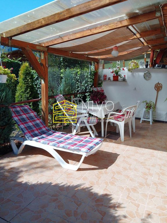 Curtea este amenajată și include garaj cu acces direct din stradă, magazie, zonă de grătar, piscină și pomi fructiferi.