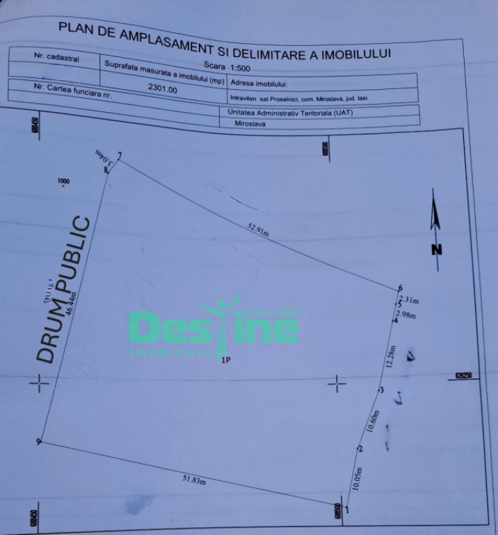 DESTINE IMOBILIARE vă propune spre vânzare un teren intravilan situat în zona Proselnici- Miroslava, o locație în plină dezvoltare, ideală pentru construcții rezidențiale sau investiție. Caracteristici principale: - Suprafață: 2.031 m² - Deschidere la drum: 46,44 metri - Utilități: apă, gaz, curent și canalizare – toate se află la limita proprietății - Acces: drum pietruit - Parcelabil Transport public: stație de mijloace de transport în comun aflată la câteva minute de mers pe jos. Preț: 46.000 EURO Pentru mai multe detalii sau pentru programarea unei vizionări, nu ezitați să mă contactați: 0757.910.832 Ilie Loghin Cod ofertă: P- 4441 Id intern: P4441