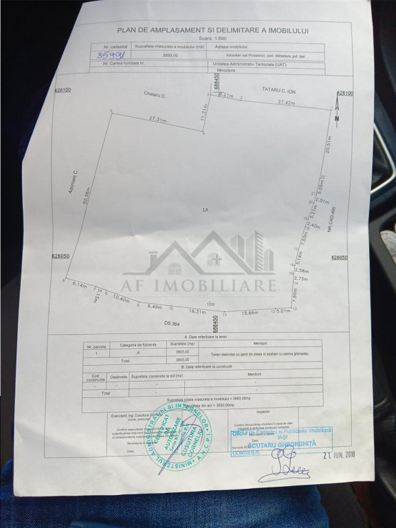 Ag. A.F.Imobilare va propune spre vanzare un teren in suprafata de 3893mp intravilan, suprafata plana, deschiderea la str. de 69ml, laterala dr. 61,56ml si laterala stg. 51ml. drumul este asfaltat pana la inceputul terenului nostru dupa care este pietruit.