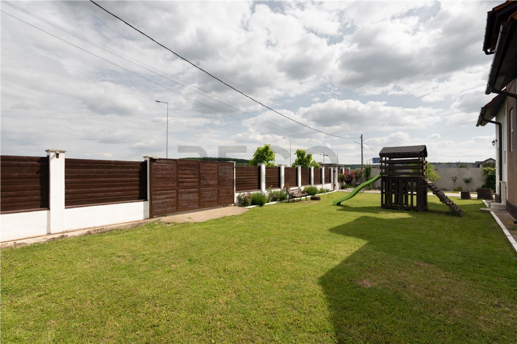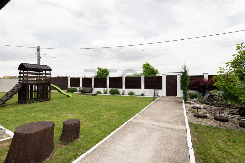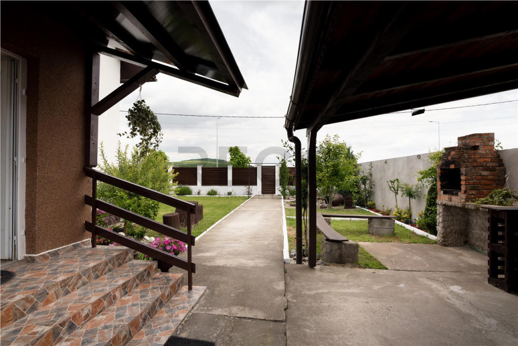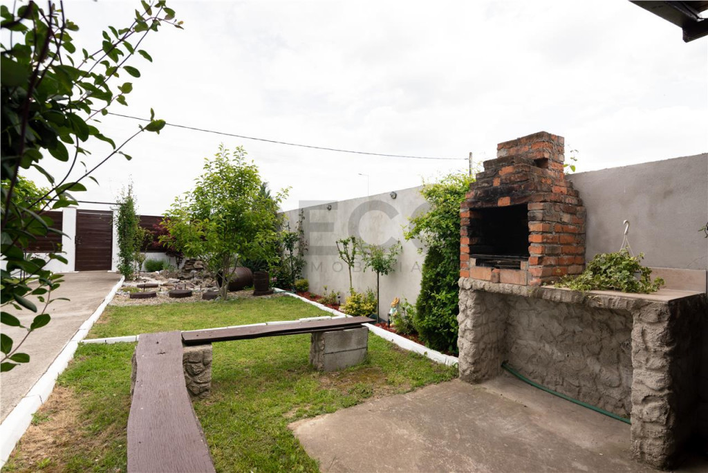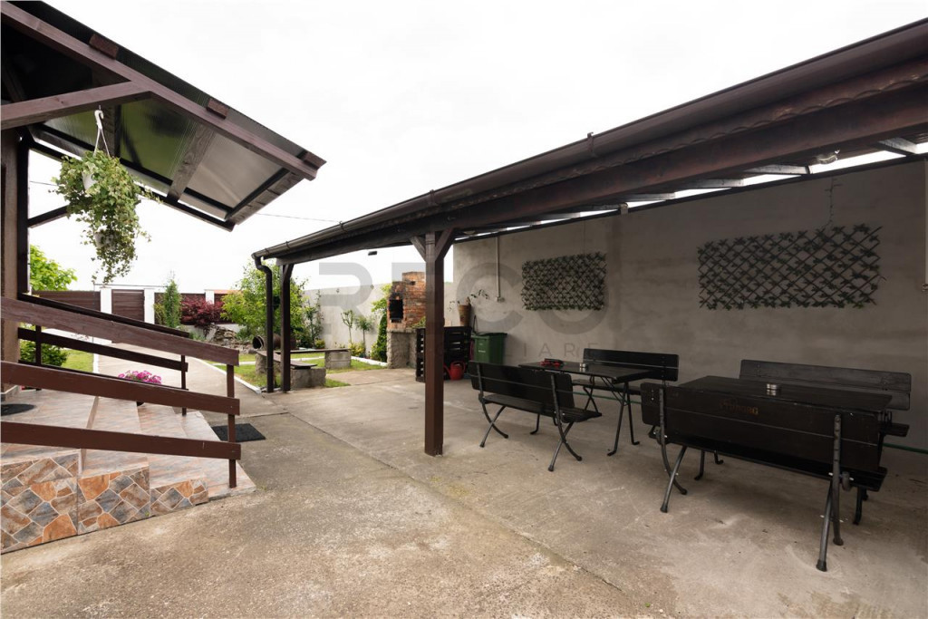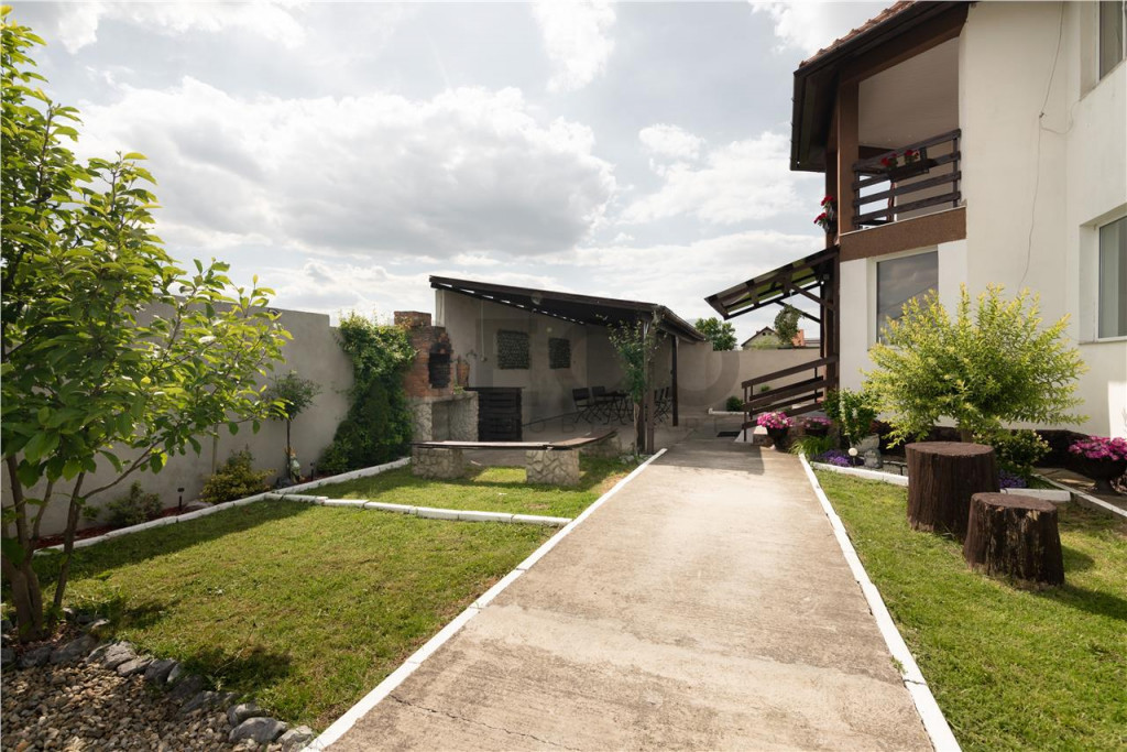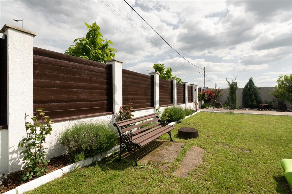 Curtea este betonata si decorata cu gazon, flori decorative unde avem si un foisor.