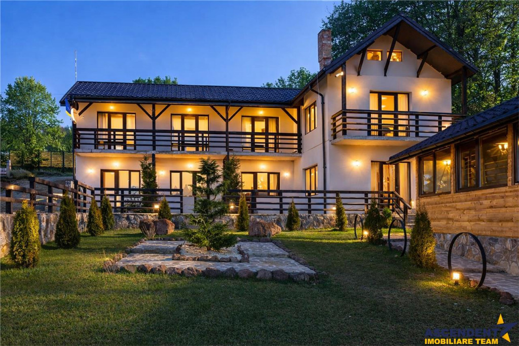 Comision cumparator. 2% TVA din valoarea de tranzactionare. ASCENDENT IMOBILIARE va propune spre vanzare, o Pensiune noua, la cheie, amplasata intr-un cadru natural deosebit, in imediata apropiere a Castelului Bran, in pitoreasca zona montana Bran ndash; Moieciu, judetul Brasov. Regiunea este recunoscuta pentru frumusetea peisajelor si pentru aerul curat de munte, oferind un decor autentic, incarcat de farmec si liniste, unde natura si confortul modern se imbina armonios. Film Prezentare: la identificare Terenul are o suprafata de 1.100 mp, cu o deschidere de 24 ml la drum asfaltat, iar constructia se ridica pe o amprenta de 136 mp, cu o suprafata construita de 272 mp. Imobilul este dotat cu toate utilitatile necesare pentru a asigura un trai confortabil, beneficiind de centrala termica pe gaz, termosemineu pe lemne, apa curenta, curent electric trifazic, conexiune la internet si fosa septica. Structura este dispusa pe parter si mansarda, fiind gandita astfel incat sa raspunda celor mai exigente cerinte de calitate si functionalitate. Compartimentarea interioara ofera spatii generoase si bine organizate, cuprinzand camere luminoase si moderne, fiecare cu baie proprie, apartamente cu living, dormitor si baie, o bucatarie utilata si un living de 50 mp cu bucatarie open space si baie de serviciu. Intreaga configuratie este conceputa pentru a imbina intimitatea cu spatiile comune, rezultand o locuinta primitoare, eleganta si practica. Curtea complet amenajata cu gazon si plante ornamentale adauga un plus de rafinament si relaxare, iar foisorul de 32 mp, dotat cu gratar, cuptor si plita, creeaza cadrul ideal pentru momente petrecute in aer liber. Proprietatea permite parcarea a 4 ndash; 5 autoturisme in curtea interioara, aspect care sporeste gradul de confort si accesibilitate. Pozitionarea intr-o zona linistita, cu priveliste panoramica de vis catre Muntii Piatra Craiului, transforma aceasta oferta intr-o oportunitate deosebita, atat pentru utilizare ca resedinta permanenta sau casa de vacanta, cat si pentru valorificare in scop turistic. Atmosfera unica a zonei Bran ndash; Moieciu, imbinata cu facilitatile moderne ale imobilului, recomanda aceasta proprietate drept una dintre cele mai atractive optiuni disponibile pe piata imobiliara montana. Certificat Energetic proprietate: Cladire certificata clasa A cu un consum anual specific de energie [KWh/msup2;an] 164.7 Indice de emisii echivalent CO2 [KgCO2/msup2;an] 7 Consum anual specific de energie din surse regenerabile [kWh/msup2;an] 0 Recomandam oferta celor ce isi doresc o casa de vacanta la munte dar si celor ce doresc sa dezvolte o afacere in regim de pensiune intr-una dintre cele mai cautate zone montane, cu un randament foarte bun.. Consilier specializat pe aleasa oferta: domnul Florin Tonu Telefon/ WhatsAp: 0721 218 273 Detalii, fotografii suplimentare si alte variante exclusive : www.ascendentimobiliare.ro