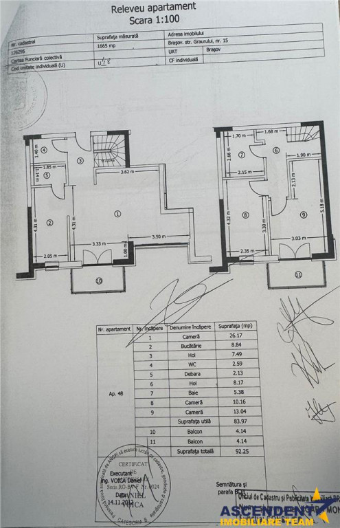 Comision cumparator: 2% TVA, din valoarea de tranzactionare. ASCENDENT IMOBILIARE este onorata sa va prezinte spre vanzare un apartament tip penthouse,situat in Avantgarden, Bartolomeu, pe strada Graurului, la etajul 6 al unui imobil modern cu lift, intr-o zona apreciata pentru liniste, aer curat si panorama spre Tampa. Va invitam sa experimentati o vizionare initiala, din locatia unde va aflati, chiar acum, prin accesarea turului virtual tridimensional: https://my.matterport.com/show/?m=oLDNphFDHGw Locuinta are o suprafata utila de aproximativ 84 mp si o suprafata totala de 92 mp, fiind compartimentata pe doua niveluri. Zona de zi este organizata in concept deschis, cu living generos de peste 26 mp si bucatarie de aproape 9 mp, creand un spatiu aerisit, luminos si perfect pentru relaxare sau socializare. Scara interioara adauga un plus de dinamica si separa natural zona de noapte, oferind intimitate si confort. La nivelul inferior regasim doua dormitoare bine proportionate si doua bai, ceea ce transforma acest apartament intr-o alegere ideala pentru o familie moderna sau pentru cei care isi doresc un spatiu suplimentar pentru birou sau hobby. Fiecare nivel beneficiaza de propriul balcon, ambele cu vedere deschisa spre Tampa, un detaliu valoros care aduce lumina naturala si un sentiment autentic de libertate. Imobilul este construit in 2012, din caramida, izolat exterior, cu centrala termica proprie, calorifere, tamplarie PVC si interfon. Rezidenta dispune de contorizare individuala pentru apa, gaz si curent, internet prin fibra optica, iar panourile solare pentru apa calda reprezinta un avantaj major din punct de vedere al eficientei energetice si al costurilor reduse pe termen lung. Complexul Avantgarden este recunoscut pentru infrastructura bine dezvoltata, acces rapid catre mijloace de transport, supermarket, zona comerciala, scoli si gradinite, spatii verzi si alei largi. Strazile sunt asfaltate si iluminate, iar comunitatea este una stabila si bine organizata. Cu vedere care inspira si cu o compartimentare care ofera echilibru intre deschidere si intimitate. Este potrivit pentru cumparatorii care cauta mai mult decat metri patrati: cauta lumina, panorama, eficienta si un stil de viata armonios intr-unul dintre cele mai cautate cartiere din Brasov. Consilier dedicat alesei oferte: doamna Gabriela Petrescu Telefon/ WhatsApp: 0741 221 323 Detalii, fotografii suplimentare si alte oferte similare exclusive: www.ascendentimobiliare.ro