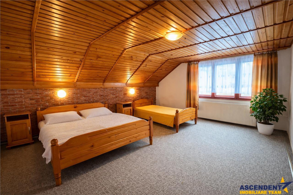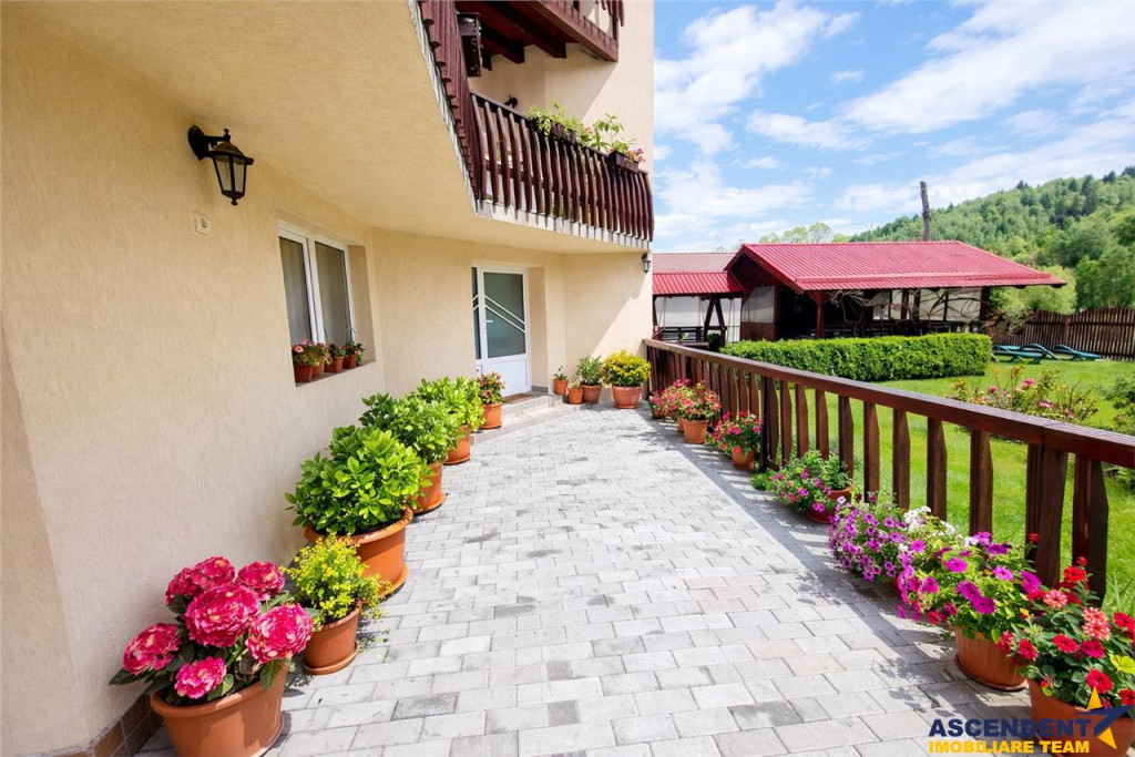 Comision cumparator: 0% din valoarea de tranzactionare. ASCENDENT IMOBILIARE propune spre vanzare in REPREZENTARE IMOBILIARA, o proprietate pozittionata in statiunea turistica, Bran, un loc fermecator, situat in inima Romaniei. Aceasta destinatie turistica populara este renumita in intreaga lume pentru castelul sau medieval Castelul Bran sau Castelul Contelui Dracula.Bran, ce ofera o combinatie unica de peisaje impresionante, istorie bogata si mituri fascinante. Amplasata in localitatea Moeciu de Jos, pe Strada Principala nr.431, va prezint o pensiune care functioneaza deja in regim hotelier, cu un rating foarte bun de 4,5*. Va invitam sa experimentati o vizionare initiala, din locatia unde va aflati, chiar acum, prin accesarea turului virtual/ si a filmului de prezentare: Tur virtual tridimensional: https://my.matterport.com/show/?m=vTKGV5NMfGr Film prezentare: https://www.youtube.com/watch?v=kHlNXAkt5Qg Proprietatea functioneaza in sistem turistic din anul 2002, este dispusa pe un teren de 685 mp si beneficiaza de un view care iti taie rasuflarea catre munti. Desfasurat pe o suprafata utila de 294 mp, cu o structura din caramida cu planseu din beton, imobilul este dispus pe P E M si are urmatoarea configuratie: PARTER: - bucatarie cu spatiu de dinning, un dormitor gen suita pentru familie cu copii, o camera transformata in sala de fitness, baie , camera tehnica cu centrala termica Viesmann de 60 kw, pivnita ETAJ: - 2 camere, sala de mese tip living, baie, spatiu depozitare tip camara, terasa cu view mixt catre curtea interioara, dar si catre munti - hol cu scara de trecere Mansarda: - 3 camere deservite de o baie, spatiu pentru depozitare, terasa deschisa cu spatiu amenajat pentru relaxare Vila dispune de doua foisoare minunate acoperite, loc de barbecue, dar si de zone de relaxare pentru copii, peisajul montan din jur, fiind o adevarata provocare pentru drumetii si explorari in natura. Detalii tehnice: - anul de constructie este 1999, dar darea in folosinta si camerele de la mansarda au fost construite in 2002 - intre parter si etaj este placa de beton, intre etaj si mansarda este placa de lemn - incalzire cu centrala pe gaz (de curand a fost instalat gazul in zona) tamplarie geamuri PVC, usi lemn, fosa septica (se lucreaza in prezent la sistemul de canalizare a localitatii). Acoperisul este din tigla, cladirea este reabilitata termic Proprietatea dispune de o curte generoasa, cu 5 locuri de parcare, fiind o oaza de liniste si incarcare cu energie pozitiva, cu un view de vis. Imobilul este deservit de spatti conexe tip dependinte, magazie cu spatiu pentru depozitare, doua pivnite etc. Recomandam pensiunea pe segmentul investitional, beneficiind deja de aprecierea clientilor care revin cu drag, fiind o statiune turistica cu atractii de neuitat si peisaje pitoresti. Invitam colegii la colaborare, onoram agentul/agentia cu comisionul aferent! Echipa de Consilieri specializati pe oferta: Gilda Georgescu Telefon/ WhatsApp: 0722.807.623 Nicolae Pavel Telefon/WhatsApp: 0720 500 650 Detalii, fotografii suplimentare si alte variante similare exclusive: www.ascendentimobiliare.ro