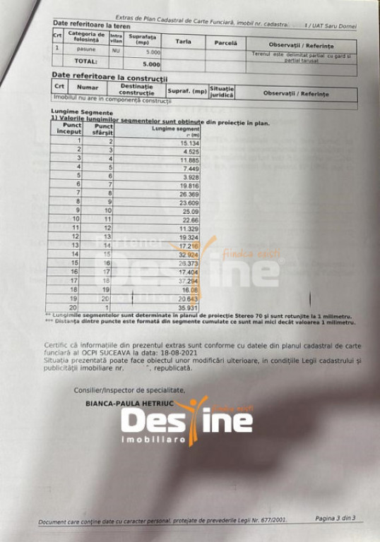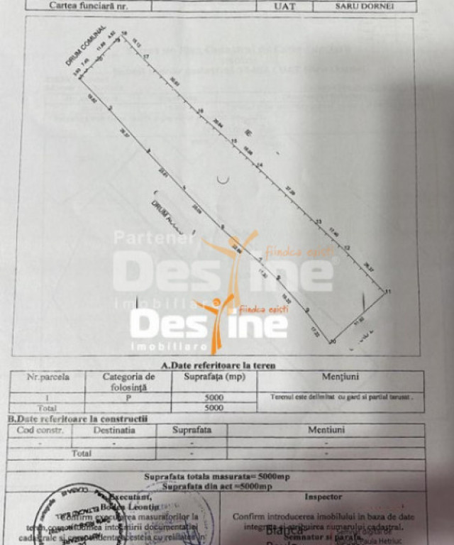 ***DESTINE IMOBILIARE Iași vă recomandă un TEREN EXTRAVILAN avand o suprafata de 5000 mp, în zona SARU DORNEI - Suceava. * Front stradal 28 metri liniari , 280 m lungime *Este situat la drum pietruit. * La 900 m de Hotelul Perla Sarisoului * Partial padure *Se afla amplasat intr-o zona foarte linistita , cu o panoramica de exceptie ! OPORTUNITATE IDEALA PENTRU INVESTITII ! Prețul de vânzare este de 22.500 EURO negociabil Detalii și informatii suplimentare: 0757.910.832 - Ilie Loghin COD OFERTĂ : P- 2514 Id intern: P4707