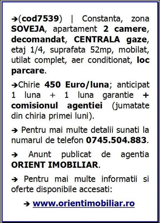 (cod7539) | Constanta, zona SOVEJA, apartament 2 camere, decomandat, CENTRALA gaze, etaj 1/4, suprafata 52mp, mobilat, utilat complet, aer conditionat, loc parcare. Chirie 450 Euro/luna; anticipat 1 luna + 1 luna garantie + comisionul agentiei (jumatate din chiria primei luni). Pentru mai multe detalii sunati la numarul de telefon 0745.504.883. Anunt publicat de agentia ORIENT IMOBILIAR.
