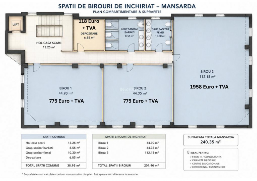 Agenția Invest Imobiliare oferă spre închiriere 9 spații de birouri într-o clădire renovată complet (2026), cu lift, situată în Galata – vis-a-vis de Penny Market, lângă Spitalul de Recuperare și Lidl, IASI. ???? Suprafețe disponibile: 30 – 112.15 mp ???? Total disponibil: 515 mp ???? 6 spații la etajul 2 + 3 spații la etajul 3 ???? Grupuri sanitare pe fiecare nivel + spațiu depozitare ???? Posibilitate parcare ???? Încălzire cu centrală proprie Spațiile pot fi închiriate individual sau integral. ???? 0752 489 020 / 0774 519 519 Id intern: P8815