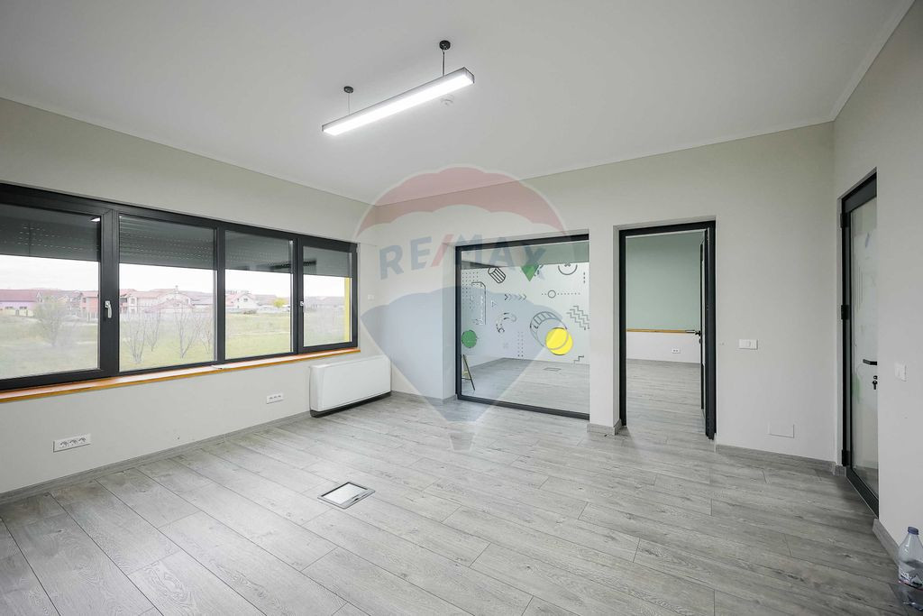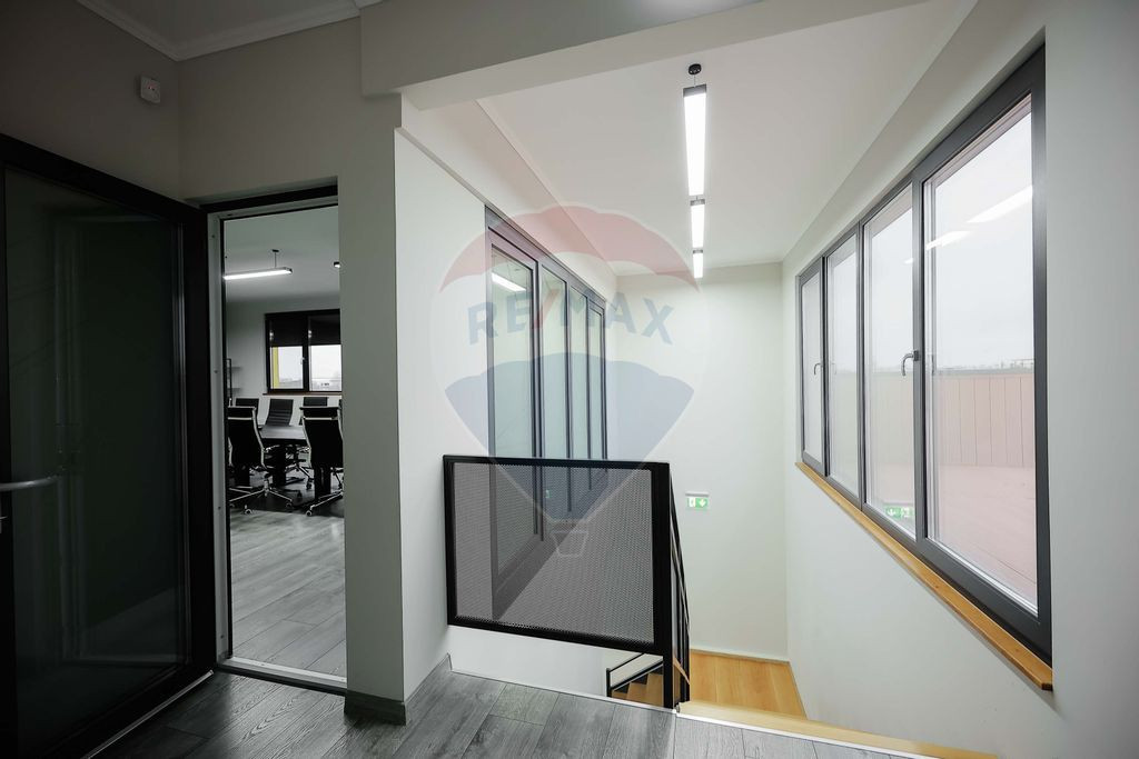 La etajul 1 este disponibil un spațiu de 46 mp - 598 € + TVA (cu toate utilitățile incluse) + 138 € + TVA (tarif integrat pentru curățenie și materiale consumabile necesare menținerii standardelor de igienă: 3 €/m²) acesta este compartimentat în două birouri distincte, separate de un perete vitrat care păstrează luminozitatea și continuitatea vizuală. Este un spațiu modern, potrivit pentru echipe care au nevoie atât de un open-space, cât și de un birou privat pentru management, întâlniri sau activități ce necesită discreție.