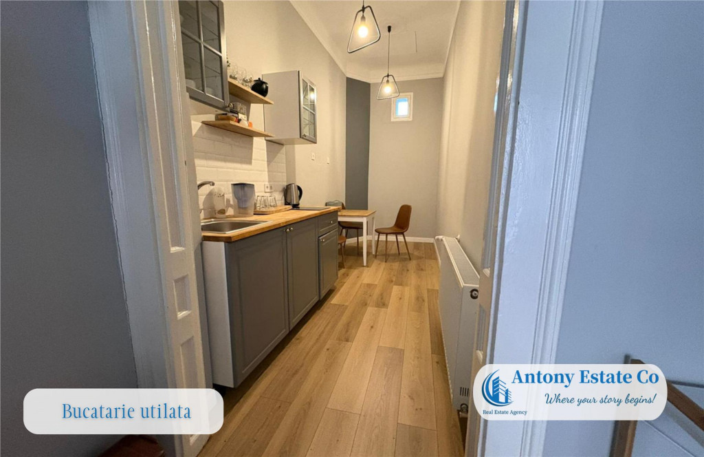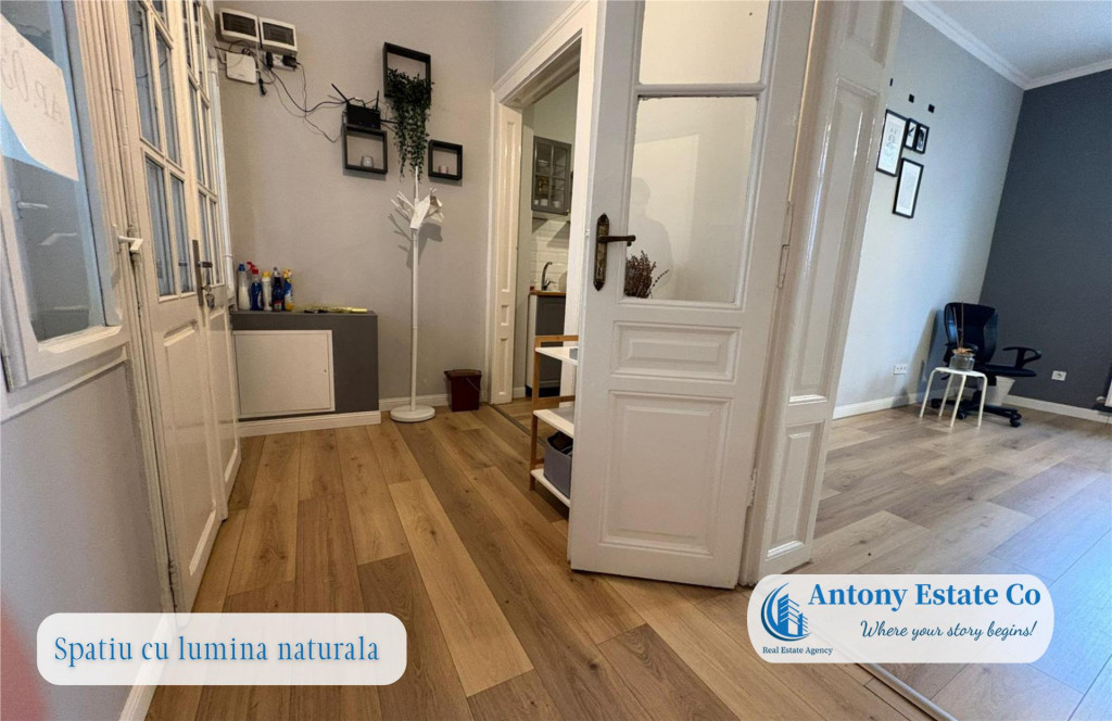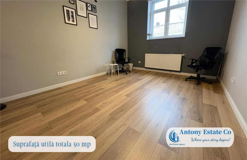 COD: DC Va propunem spre inchiriere un spatiu birou ultracentral, in Oradea, Piata Unirii, Iuliu Maniu, ideal pentru birouri juridice, IT, comerciale, consultanta, sediu de firma. Acest spatiul este la parterul cladirii, intr-o curte comuna, are o suprafata utila totala de 50 mp, inchiriabil la pretul de 9 eur/mp TVA. Pretul final de inchiriere este de 450 eur si include toate utilitatile aferente spatiului !! La preluarea imobilului, se percepe valoarea cumulata a unei chirii lunare (cu titlu de garantie) prima chirie in avans. Perioada minima acceptata pentru inchiriere este de 2 ani. Pretul chiriei este negociabil pentru cei care aleg plata cumulata, in avans, pentru o perioada de minim 1 an. Spatiul descris se afla la parterul cladirii. Compartimentarea totala este prezentata in felul urmator: - 1 Terasa intrare - 15 mp ; - 1 Vestibul acces; - 1 Bucatarie utilata; - 1 Birou principal; - 1 Spatiu depozitare; - 1 Baie Proprietatea este construita din caramida, fiind o cladire robusta, cu pereti portanti de dimensiuni generoase, spatii vitrate impresionante. Confortul termic, pentru sezonul rece, este realizat prin centrala proprie gaz, dispunand de un sistem complet de incalzire prin calorifere. Parcare in fata imobilului principal, zona 0. Accesul facil in proprietate se face din Piata Unirii, zona pietonala. Icirc;n apropierea acestui imobil se gasesc: loc de joaca pentru copii, statii de autobuz si tramvai, gradinite, scoli, restaurante, hoteluri, acces imediat spre centrul orasului. Informatiile tehnice au caracter orientativ, acestea fiind preluate de la proprietar. Pentru mai multe detalii si vizionari, ne puteti contacta telefonic la numarul din anunt. Antony Estate CO - Where your story begins!