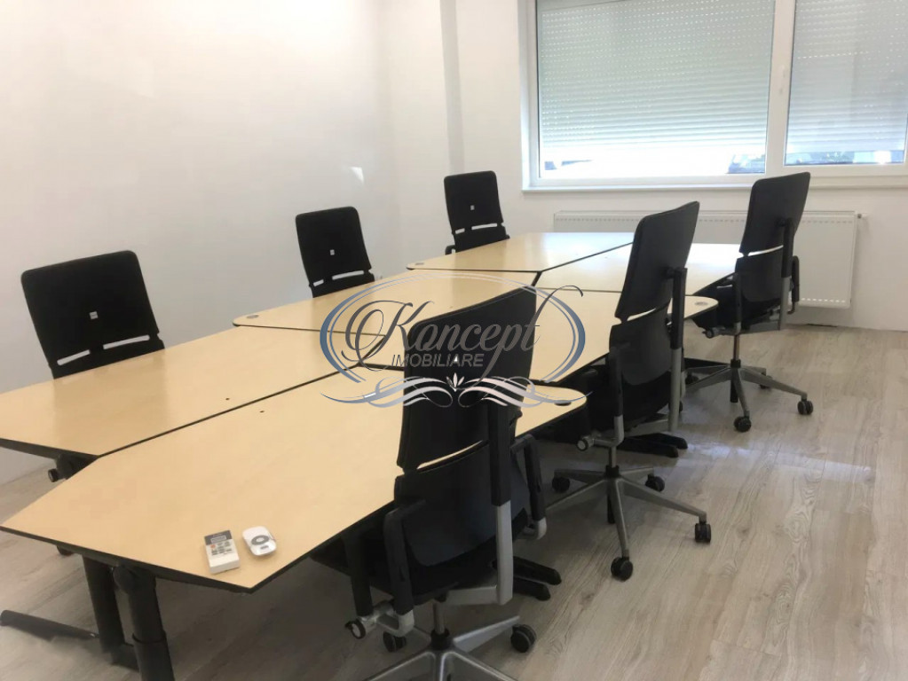 Koncept Imobiliare propune spre inchiriere un spatiu de birouri complet echipat, situat intr-o zona semicentrala, pe strada Traian, la parterul unei cladiri mixte moderne, cu 7 niveluri. Zona beneficiaza de acces facil catre centrul orasului, statii de transport public, restaurante si puncte de interes pentru mediul de afaceri, fiind o locatie excelenta pentru companii care doresc vizibilitate si eficienta logistica. Biroul dispune de 61 mp utili, compartimentati in doua incaperi luminoase si functionale, cu o terasa de 8,5 mp si doua locuri de parcare incluse. Accesul auto si pietonal este facil, iar sistemul de supraveghere video si controlul accesului asigura siguranta permanenta. Spatiul include un grup sanitar si beneficiaza de lumina naturala generoasa. Finisajele si dotarile sunt de nivel premium: sistem de iluminat LED, aer conditionat cu inverter in fiecare camera, centrala proprie, mobilier ergonomic Steelcase si retea interna CAT6. Prima incapere este configurata cu 6 statii de lucru complet echipate, iar cea de-a doua este amenajata pentru management sau sedinte, cu masa de conferinta si pat rabatabil integrat. Jaluzelele electrice, dotarile media si mobilierul fac din acest spatiu o solutie imediat functionala, fara investitii suplimentare. Pentru spatiu complet echipat chiria este 1.200 euro, la pretul afisat se poate discuta despre echipamentul ce ramane in spatiu. Recomandat pentru firme de IT, contabilitate, arhitectura sau servicii profesionale, biroul este potrivit pentru echipe de 6–8 persoane care apreciaza confortul si eficienta unui spatiu complet pregatit de lucru. Se inchiriaza mobilat, utilat si este disponibil imediat. Actele au fost verificate si validate de agentie. Pentru informatii complete, programarea unei vizionari sau pentru a afla oferta noastra completa va stam la dispozitie telefonic, prin e-mail sau la sediul agentiei noastre, pe str. Aviator Badescu, nr. 19, Cluj-Napoca. Id intern: P20864