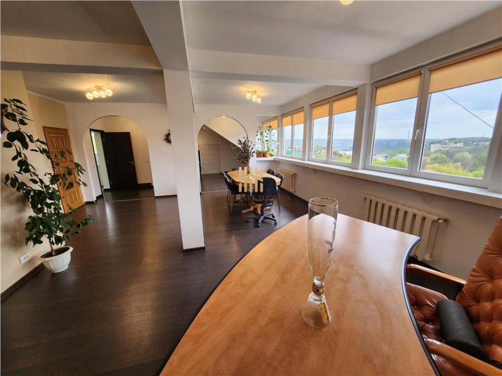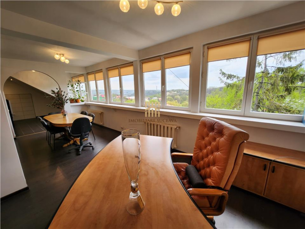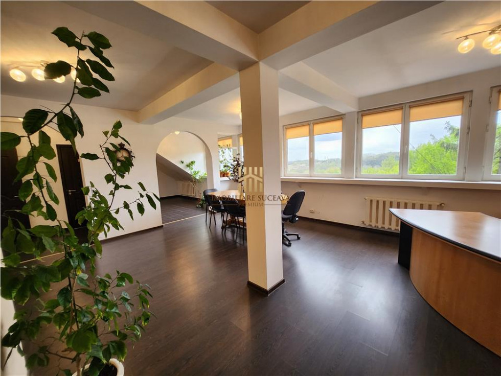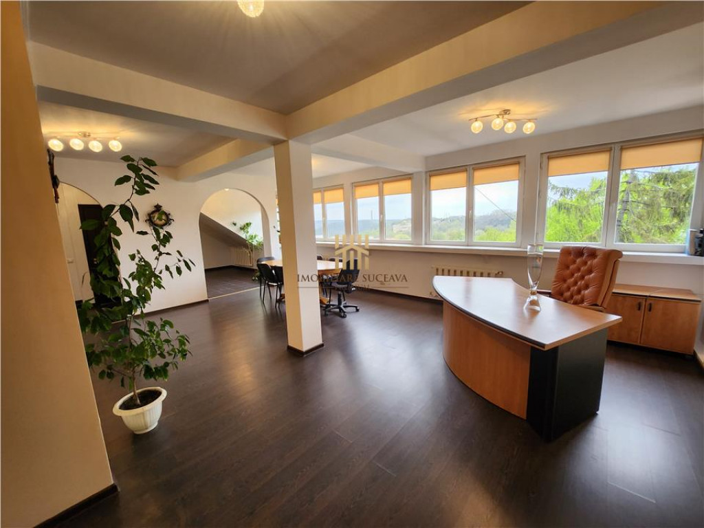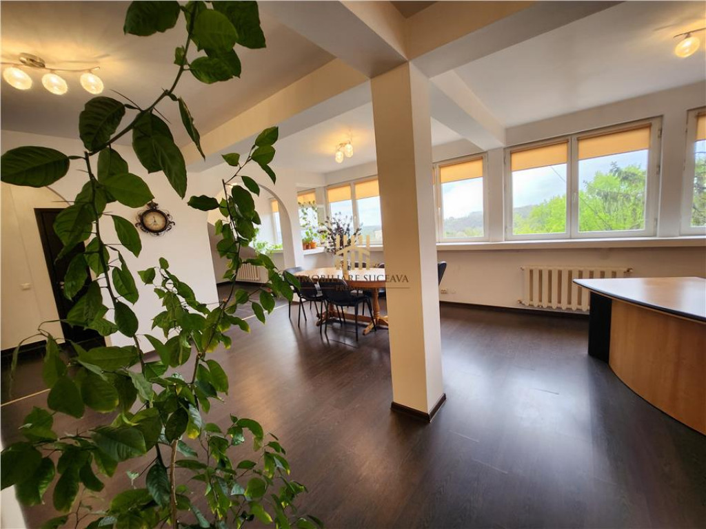 Spatiu birouri 203 mp - Ultracentral! Zona excelenta! Priveliste superba! Se poate vedea toata zona cetatii si cetatea Sucevei pe geam! In apropiere de Mc Donald#39;s! Mijloace de transport public in comun la discretie - toate trec prin centru! Compartimentat in 9 birouri! Cu 2 bai si spatiu pentru facut cafea! Aer conditionat si centrala termica proprie! Etajul 5, plus pod de 60 mp! Singur pe etaj! Construit in sistem canadian, ceea ce inseamna o eficienta energetica cu 50% mai buna! Pret: 150000 euro! Detalii: 0727817187