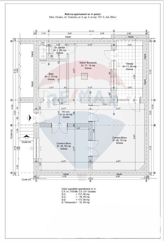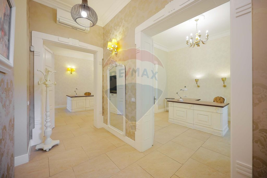 Spațiul este situat ultracentral, pe Strada Teatrului nr. 6, într-o curte interioară retrasă, care oferă acces facil, dar fără expunere directă la trafic și zgomot. Această poziționare îl face potrivit pentru activități profesionale care presupun întâlniri recurente cu clienți și necesită un cadru liniștit: juridic, consultanță, psihoterapie, servicii private sau activități similare. Proprietatea a fost renovată complet în 2023 și este funcțională integral. Are o suprafață utilă de 78,45 mp, este amplasată la parter și este compartimentată în două birouri bine proporționate, două băi, bucătărie și hol de acces. În completare, există o terasă privată de 12,55 mp, precum și două boxe la subsol. Spațiul se vinde în forma actuală, conform imaginilor, fără a fi necesare lucrări suplimentare sau investiții ulterioare. Compartimentarea este clară și eficientă, permițând desfășurarea activității fără interferențe între zonele de lucru și cele de întâlnire. Finisajele și dotările au fost alese cu accent pe durabilitate, funcționalitate și întreținere facilă, nu pe elemente decorative temporare. Proprietatea este pregătită pentru utilizare imediată, ceea ce reduce semnificativ timpul și costurile de punere în funcțiune. Detalii tehnice: - Uși din lemn masiv, replici ale originalelor - Culori de la Benjamin Moore - Lumini Nicolazzi Italia (aluminiu suflat cu bronz) - Baterii Nicolazzi Italia (bronz masiv inoxidabil) - Bucătărie la comandă, blat granit, echipare Samsung - Ventilație bucătărie Elicent, Italia (tuburi ceramice reglabile) - Gresie antiderapantă + antireflectorizantă, grosime 2 cm, meșterită în cuptor tradițional, Grecia - Mobilier birouri lemn masiv, blat cireș, la comandă - TV Sony - Încălzire în pardoseală TECE, centrală electrică și boiler - Sistem electric nou - Sisteme video & securitate de la Bitroot, control din aplicație - Ferestre + ușă intrare Gealan, profil S900, sticlă Tripan - Jaluzele electrice cu telecomandă - Pergolă electrică la terasă - Climatizare Mitsubishi - Izolație exterior cu vată grafitată - Tratament anti-mucegai cu injecție perimetrală și la adâncime de 20 cm, cu tehnologie tip Chemical Injection Damp Proofing Elementele de design și obiectele din spațiile comune au fost selectate coerent și contribuie la un ambient profesionist, fără a încărca inutil spațiul. Accentul cade pe funcționalitate, confort și o imagine corectă pentru activități cu interacțiune directă cu publicul. Proprietatea reprezintă o opțiune potrivită pentru cei care caută un spațiu de birouri ultracentral, complet funcțional, cu terasă privată și costuri predictibile de exploatare. Pentru informații suplimentare sau programarea unei vizionări, vă invit a mă contacta la numărul afișat.