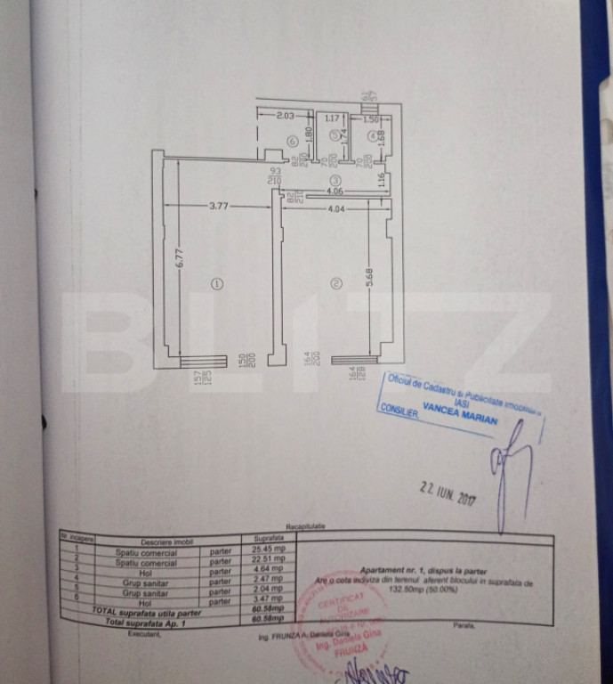 Blitz va propune spre vanzare un spatiu comercial amplasat la strada pe Aleea Strugurilor. Spatiul se afla la parterul unei case P + 1, poate fi achizitionat si pentru locuinta proprie cu schimbare de destinatie. Imobilul beneficiaza si de un loc de parcare si se mai poate amenaja unul + acces la subsol comun ca spatiu de depozitare. Compartimentare : - Incapere de 25.45 mp - Incapere de 22,51 mp - doua holuri de 4,64 si 3.47 mp - doua grupuri sanitare de 2.47 si 2.04 mp Va asteptam cu drag la vizionare! Cod ofertă / ID BLITZ: P169143 Id intern: P169143