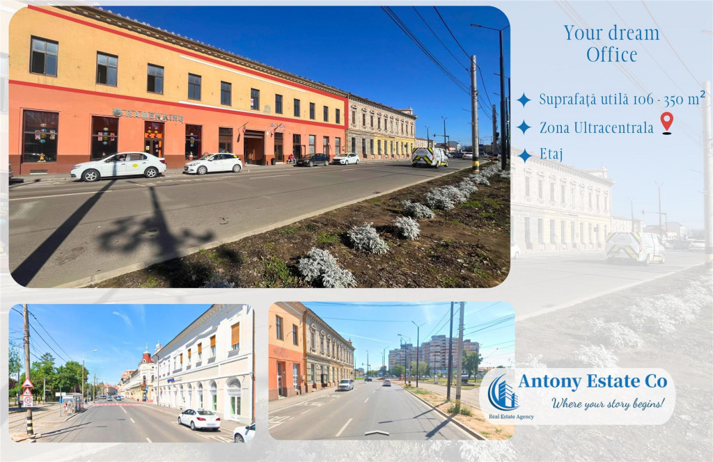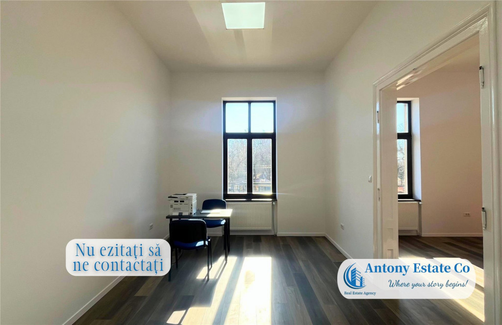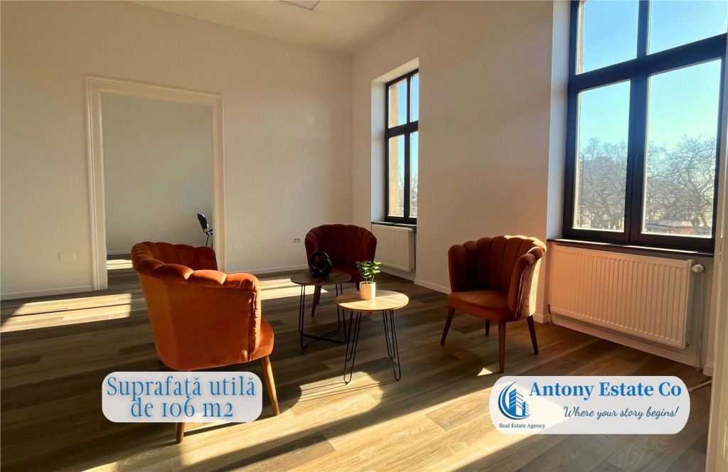 Va propunem spre inchiriere un Spatiu Comercial, Birouri, Salon, Cabinet de Icirc;nchiriat, aflat intr-o zona de maxim interes, situat in zona Ultracentrala, Piata 1 Decembrie - Oradea. Birourile sunt amplasate la Etajul cladirii. Caracteristicile spatiului: - Suprafata minima inchiriabila 106 msup2;; - Suprafata maxima inchiriabila 350 msup2;; - 3 Icirc;ncaperi; - 2 Grupuri sanitare; - Acces facil si zona cu vad comercial; La preluarea imobilului, se percepe valoarea cumulata a doua (2) chirii lunare, ca si garantie. Icirc;n apropierea acestui imobil se gasesc: Statie de autobuz, Gradinite, Scoli, Restaurante, Hoteluri, acces facil la centrul orasului. Confortul termic al imobilului este realizat de la reteaua edilitara de termoficare, cu calorifere, astfel costurile cu intretinerea sunt mici. Informatiile tehnice au caracter orientativ, acestea fiind preluate de la proprietar. Pentru mai multe detalii si vizionari, ne puteti contacta telefonic la numarul din anunt. Antony Estate CO - Where your story begins!