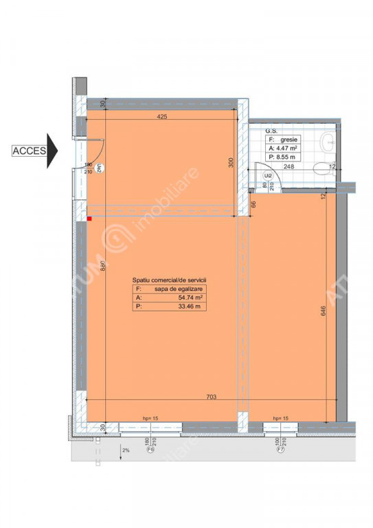 De vanzare spatiu comercial in suprafata totala de 71 mp tip open space, orientat spre Sud, pozitionat la parterul unui imobil constructie noua cu regimul de inaltime Parter 3 Etaje Pod care face parte dintr-un complex rezidential de 6 imobile, aflat in zona Pictor Brana din Selimbar. Spatiul are 59.21 mp utili si este compus dintr-o camera open space de 54.74 mp si un grup sanitar de 4.47 mp, iar inaltimea spatiului este de 3 m. Compartimentarea spatiului este open space ceea ce va ofera optiunea de a configura si amenaja spatiul in functie de tipul de afacere pe care doriti sa-l desfasurati. Acesta este pretabil pentru diferite activitati, cum ar fi: magazin alimentar, cabinet stomatologic, spatiu birouri, sediu de firma, salon infrumusetare, reprezentanta sau alte activitati cu caracter comercial. In pretul de achizitie sunt incluse si 2 locuri de parcare amenajate si delimitate situat in fata spatiului. Spatiul este intabulat si finisat la stadiul de gri care cuprinde urmatoarele finisaje: - Usa de acces securizata din PVC marca Rehau; - Pereti tencuiti ( tencuieli pe baza de var-ciment marca Adeplast ) si doua maini de glet marca Baumit ; - Pardoseli amenajate cu sapa autonivelanta semiuscata elicopterizata pregatite pentru parchet-gresie; - Tamplarie PVC marca Rehau culoare alb interior/gri antracid exterior cu 5 camere si 3 foi de sticla ( lowe-float-lowe solar ), feronerie Maco Multimatic si glafuri interior-exterior; - Incalzire prin pardoseala ( sistem Innoflow cu distribuitor Inoflou, placa termoizolatoare innotack si banda perimetrala ), centrala termica proprie in condensatie marca Bosh si detector gaz. - Sisteme elecrice din cupru trase prin copex cu tablou general si sigurante pentru consumatorii de putere marca Schneider. - Curent trifazic; - Instalatii pentru curentii slabi Internet, Telefon, TV. - Racorduri apa-canal; - Racord gaz metan; - Instalatii pentru gaz, curent electric si apa, contorizare individuala si contoare montate. Spatile comune exterioare respectiv curtea complexului dispune de spatii verzi amenajate cu gazon, arbusti si plante decorative, iar inchiderea perimetrala va fi cu gard viu (verde) .Locurile de parcare sunt supraterane, sunt delimitate si pavate cu dale din beton. Aleile pietonale sunt la randul lor pavate cu dale din beton si delimitate de spatii verzi. Valoarea de achizitie a acestuia este de 110.000 euro TVA. ID intern 1923