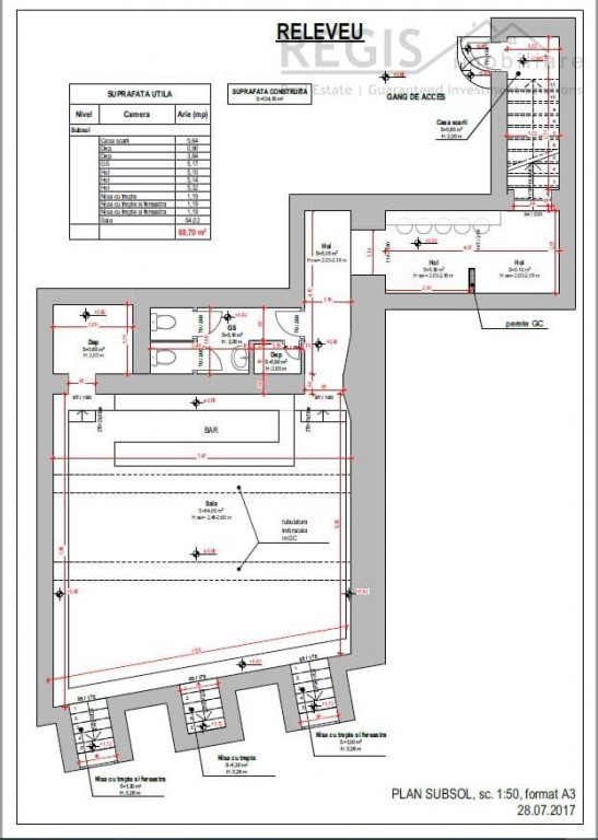 ID intern: 4946 REGIS Imobiliare va ofera oportunitatea unica de investitie in Piata Sfatului in apropierea emblematicei Biserici Negre. Acest spatiu comercial, amplasat in subsol, beneficiaza de o suprafata construita de 124 mp (90 mp utili) si un teren exterior de 73 mp, cu posibilitatea amenajarii unei terase in curtea comuna. Caracteristici principale: Compartimentare optima: O mare incapere de tip open space, ideala pentru amenajarea unui local modern (vinoteca, crama, bar sau pub), alaturi de spatiu de depozitare si 3 grupuri sanitare. Utilitati si instalatii: Toate instalatiile (electrica, sanitara si de canalizare) sunt complet refacute, iar utilitatile sunt contorizate separat, asigurand eficienta si siguranta. Confort sporit: Dotat cu aer conditionat si un sistem performant de ventilatie, cu evacuare a aerului viciat si aport de aer proaspat. Localizare de exceptie: Situat in centrul istoric, acest spatiu beneficiaza de un flux constant de turisti si localnici, datorita proximitatii cu atractii de renume precum Biserica Neagra. Brasovul, cu farmecul sau medieval si atmosfera vibranta, atrage anual mii de vizitatori, oferind afacerii dumneavoastra o expunere maxima si un potential comercial ridicat. Aceasta proprietate, cu un istoric dovedit ca vinoteca si bar-club din anul 2000, reprezinta solutia ideala pentru antreprenorii dornici sa isi extinda afacerea intr-o zona cu vizibilitate deosebita si un climat economic dinamic. Pentru mai multe detalii si pentru a programa a transforma aceasta oportunitate intr-un succes, va invitam sa ne contactati. Contact: Email: [email protected] Consultant Imobiliar: Ilie Cristian Pentru informatii suplimentare, ne puteti contacta la numarul de telefon. - Comisionul agentiei este de 2%. TVA