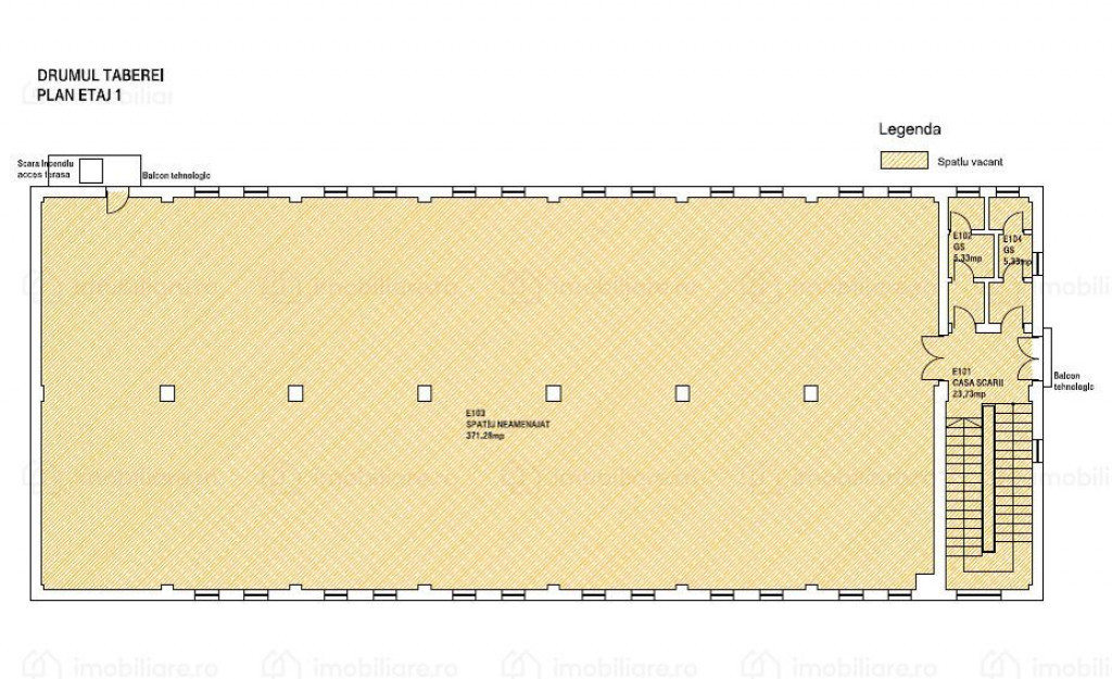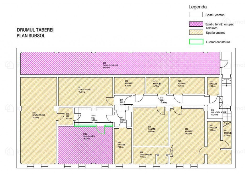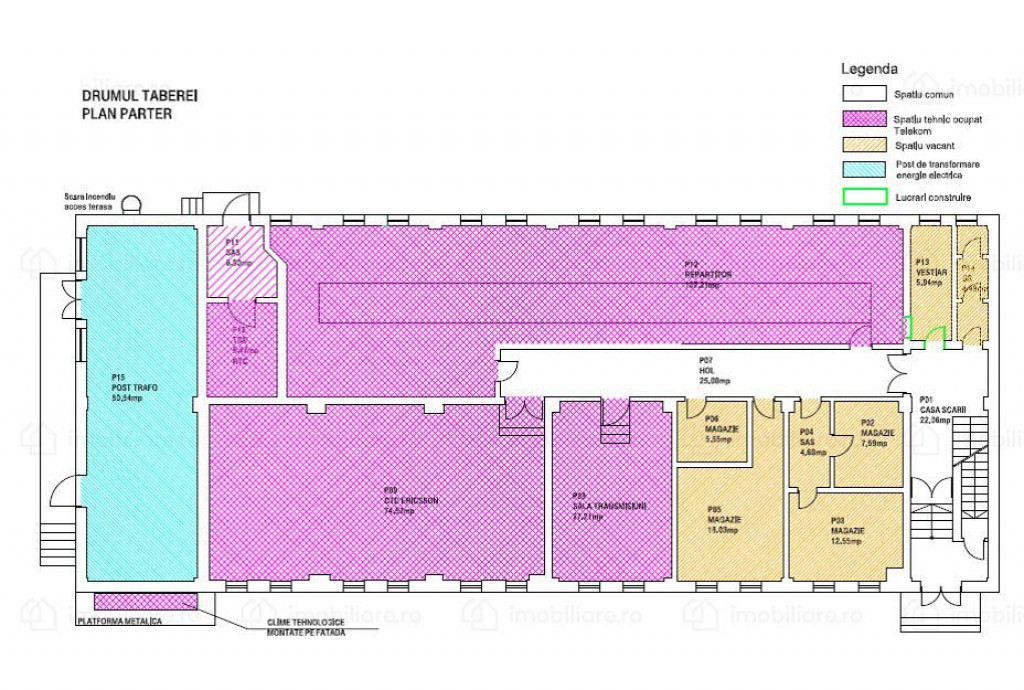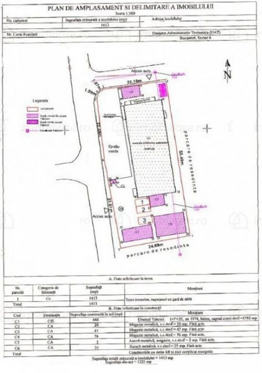 ID Proprietate: CP977013 --------------------------------------------------------------------------------- - Imobil situat in Mun. Bucuresti, Sector 6, zona Drumul Taberei si este compus din: 1. Teren intravilan, categoria de folosinta curti-constructii, in suprafata de 1.413 mp; 2. Cladire, cu suprafata construita la sol de 448 mp. - Cladirea principala are un regim de inaltime S+P+2E cu o structura de cadre din beton armat, plansee si grinzi din beton armat, precum si fundatie din beton armat; - Constructia este racordata la reteaua de electricitate, apa si canalizare. - Suprafata totala utila este de 1.047 mp, desfasurata astfel: Subsol, 180; Parter, 54 mp; Etaj 1, 406 mp; Etaj 2, 407 mp. - Inaltimea interioara este de 4,75 m; - Mijloace de transport in comun: Metrou, la cca. 100 m; Autobuz, Troleibuz; - Imobilul este pretabil pentru urmatoarele activitati economice: Sala pentru fitness; Sala de sport; Spatiu comercial; Spatiu pentru productie; Depozit etc. --------------------------------------------------------------------------------- Informatii privind inchirierea proprietatii: - Documentatie completa; - Perioada contractuala minima: 5 ani calendaristici; - Chirie lunara: 6.000 euro, +TVA; - Garantie de buna executie: Chiria pe 2 luni; - Chirie platita in avans: 1 luna; - Se acorda perioada de gratie pentru amenajare si instalarea in spatiu: 1 luna.