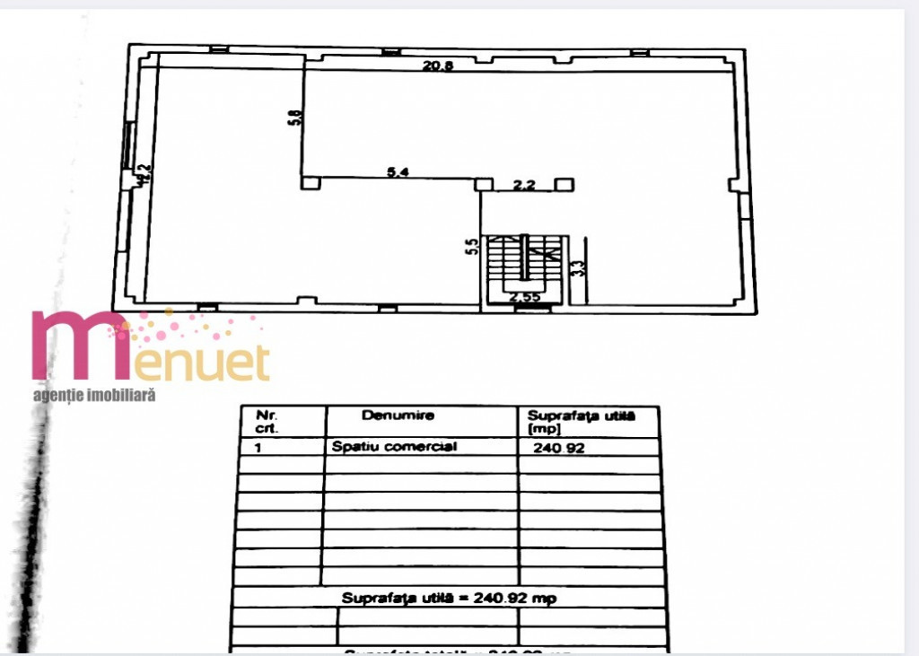 Oferim spre inchiriere spatiu comercial , situat in zona E3 , la parterul unui bloc. Suprafata totala 240 mp . Este prevazut cu 2 bai iar incalzirea se realizeaza cu ajutorul centralei proprii pe gaz . In trecut isi desfasura activitatea un cabinet medical dar spatiul  se poate inchiria si pentru alte domenii de activitate iar chiriasul si-l poate amenaja