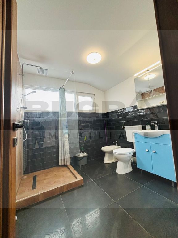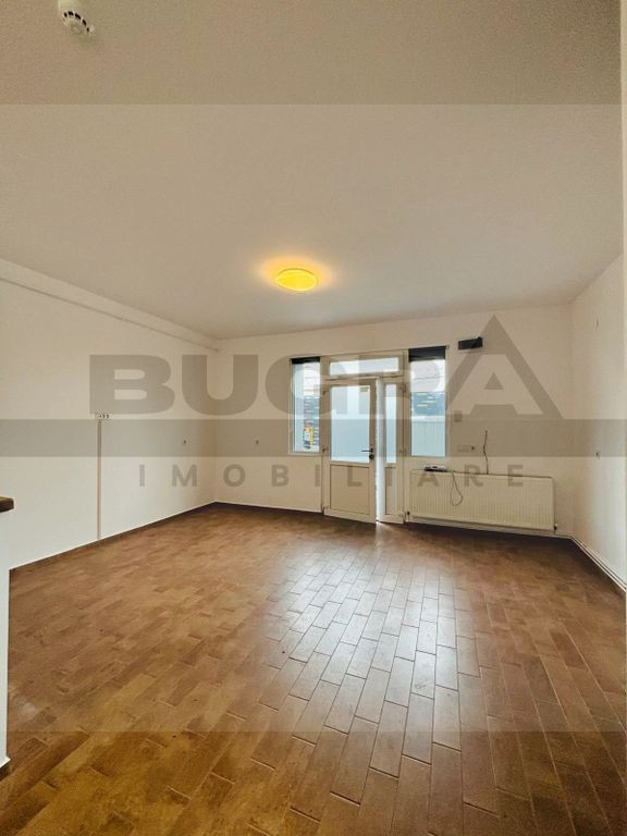 Parter: zonă de tip open-space, baie și acces către o terasă cochetă, perfectă pentru amenajarea unui spațiu de relaxare;