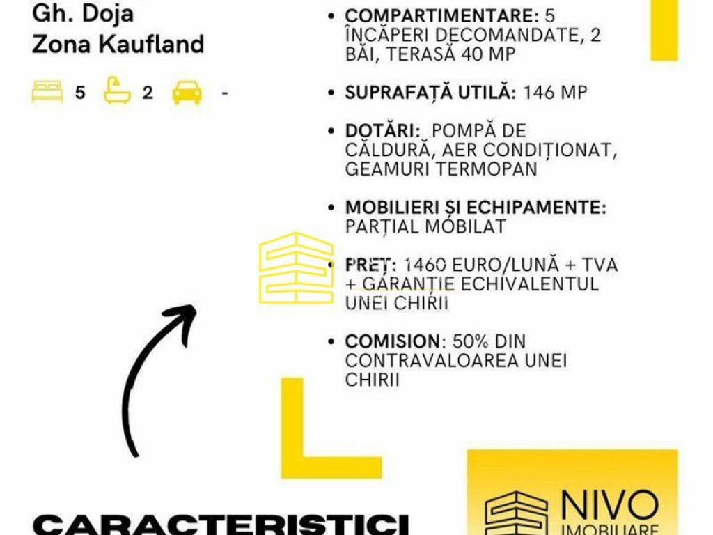 BC/70 Nivo Imobiliare vă propune spre închiriere acest spațiu de birou în Tg. Mureș, Str. Gh. Doja, zona Kaufland. Este compus din 5 încăperi decomandate și 2 băi având o suprafață totală de 146 mp. Este izolat termic, dotat cu aer condiționat, geamuri termopan și încălzire cu pompă de căldură. Dispune de o terasă de aprox. 40 mp și de loc de parcare contracost. Se închiriează parțial mobilat la prețul de 1460 Euro/lună + TVA + garanție echivalentul unei chirii. Comisionul perceput este de 50% din contravaloarea unei chirii.