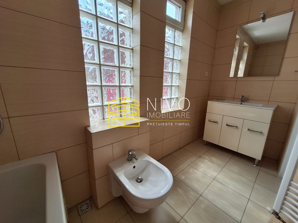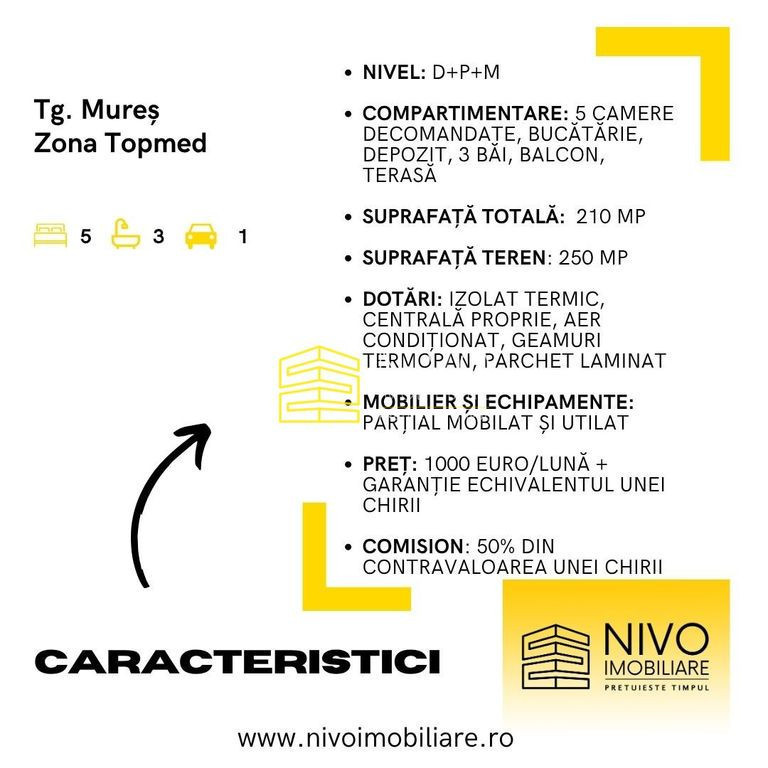 BC/104 Nivo Imobiliare vă propune spre închiriere acest spațiu de birou situat în Tg. Mureș, Semicentral, Zona Topmed. Imobilul este dispus pe 3 niveluri (D+P+M) având suprafața totală de 210 mp și este compus altfel: Demisol: bucătărie, 1 încăpere, loc de depozitare, baie Parter: 2 încăperi, baie, terasă Mansardă: 2 încăperi, baie, balcon Este izolat termic, dotat cu centrală proprie, aer condiționat, geamuri termopan și parchet laminat. Dispune de un teren de 250 mp, cu acces auto. Se închiriază parțial mobilat și utilat la prețul de 1000 Euro/lună + garanție echivalentul unei chirii. Comisionul perceput este de 50% din contravaloarea unei chirii.