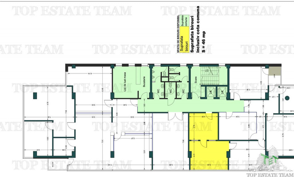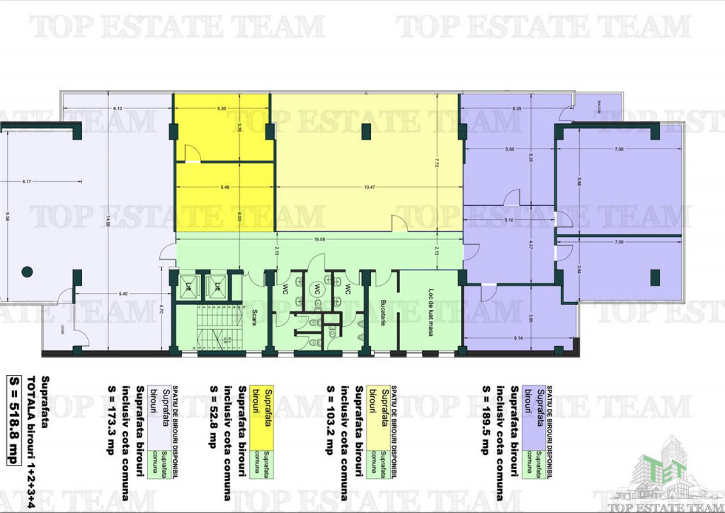 Etaj 5 ndash; Spatiu de birouri 174 mp (inclusiv cota comuna) Spatiul de birouri situat la etajul 5 are o suprafata totala de 174 mp si reprezinta o solutie excelenta pentru companii care cauta un mediu de lucru modern si flexibil. Spatiul poate fi recompartimentat in functie de cerintele chiriasului (cost suportat de chirias). Chirie: 9 euro;/mp TVA Mentenanta: 3 euro;/mp TVA Facilitati incluse in mentenanta: Servicii de receptie Apa si canalizare Curatenie in spatiile comune Salubritate Intretinere instalatii (HVAC, lifturi, electrice si sanitare) Utilitati: Energie electrica si gaze naturale facturate lunar, in functie de consum Parcare (optional): Subteran: 80 euro;/loc TVA Suprateran: 40 euro;/loc TVA Se poate asigura un numar mare de locuri de parcare, inclusiv pe terenul din apropierea cladirii. Un spatiu potrivit pentru companii care doresc un birou modern, bine intretinut si adaptabil.